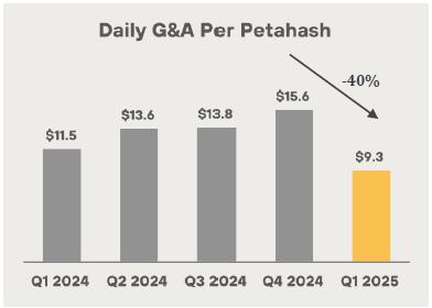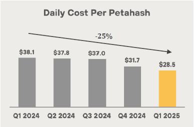 | – | 每千万亿哈希每天的成本从2024年第一季度的38.1美元提高到2025年第一季度的每千万亿哈希每天28.5美元,提高了25% |