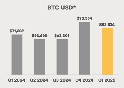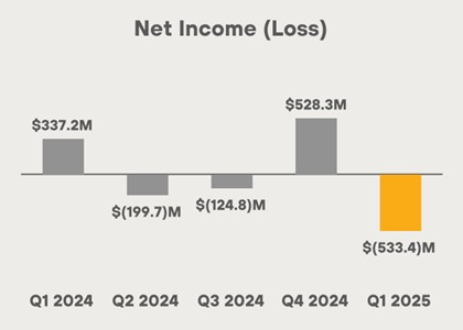 | – | 净收入(亏损)从2024年第一季度的净收入3.372亿美元或稀释后每股1.26美元下降258%至2025年第一季度的(5.334亿美元)或稀释后每股1.55美元。净收入(亏损)包括5.102亿美元的数字资产公允价值损失。 |