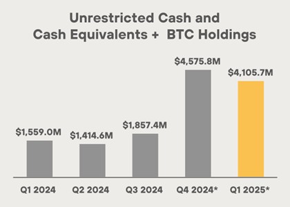 | – | 截至2025年3月31日,合并的非限制性现金和现金等价物以及BTC(包括借出和抵押的BTC)为41亿美元。 |