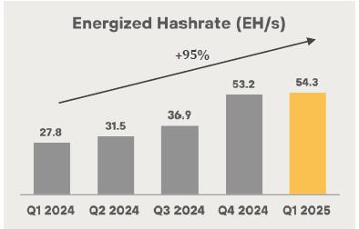 | – | 有能量的哈希率从2024年第一季度的27.8EH/s增长95%至2025年第一季度的54.3EH/s。截至2025年3月,部署了20,000台新矿机,当前能效为每太哈希19.3焦耳(“J/TH”)。 |