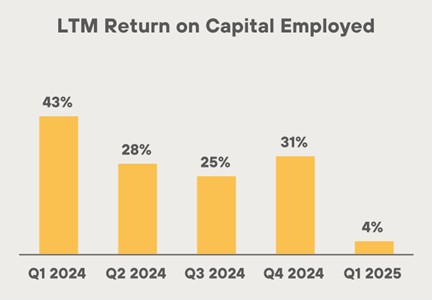 公司将调整后EBITDA定义为(a)GAAP归属于普通股股东的净收入(亏损)加上(b)调整以加回(1)利息收入、(2)利息费用、(3)所得税费用(收益)、(4)折旧和摊销以及(5)非现金和/或非经常性项目的调整,目前包括(i)股票补偿费用、(ii)衍生工具公允价值变动、(iii)投资收益和(iv)提前终止费用。该公司将所用资本回报率定义为(a)平均过去四个季度的调整后EBITDA除以(b)平均所用资本,计算方法是平均过去四个季度的总资产减去流动负债。