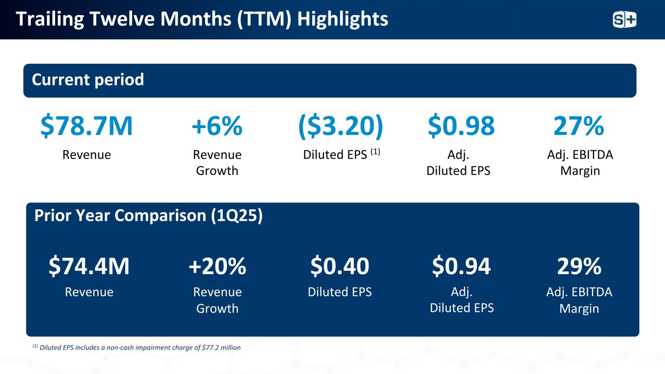 过去12个月(TTM)亮点(3.20美元)稀释后每股收益(1)7870万美元收入27%调整后EBITDA利润率+ 6%收入增长本期间上年同期比较(25年第一季度)0.98美元调整后稀释后每股收益7440万美元收入0.40美元稀释后每股收益29%调整后EBITDA利润率+ 20%收入增长0.94美元(1)稀释后每股收益包括7720万美元调整后非现金减值费用。稀释后每股收益