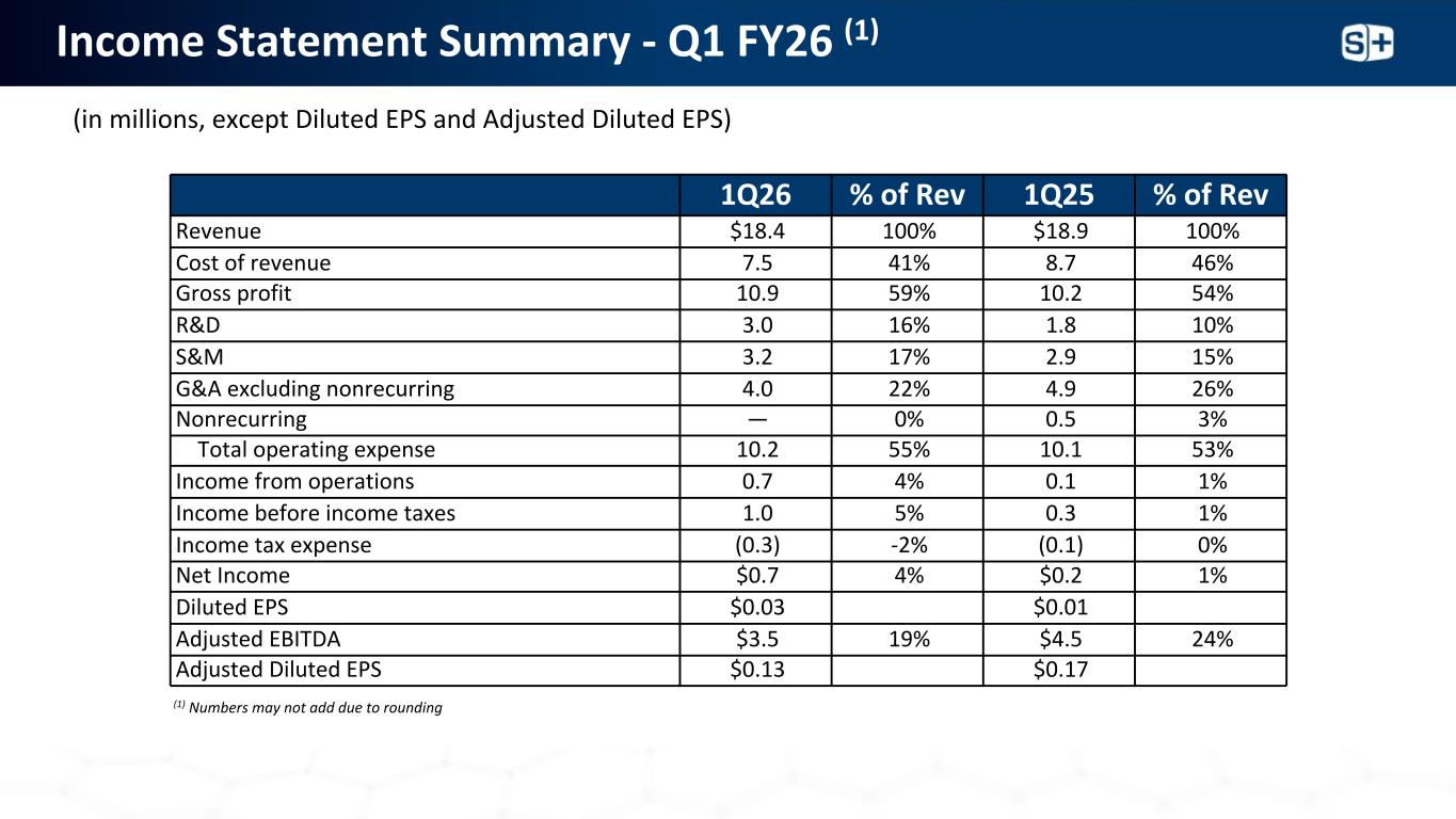 损益表摘要-Q1 FY26(1)(百万,稀释EPS除外和调整后的稀释EPS)1Q26 % rev 1Q25 % rev revenue $ 18.4 100% $ 18.9 100%收入成本7.541% 8.746%毛利10.959% 10.254%研发3.016% 1.8 10% S & M 3.217% 2.915% G & A不包括非经常性4.022% 4.926%非经常性—0% 0.53%总营业费用10.255% 10.153%营业收入0.74% 0.1%收入所得税前1.05% 0.31%所得税费用(0.3)-2 %(0.1)0%净收入$ 0.74% $ 0.2.1%摊薄后每股收益$ 0.03 $ 0.01调整后EBITDA $ 3.5 19% $ 4.524%调整后摊薄后每股收益$ 0.13 $ 0.17(1)由于四舍五入,数字可能不会相加