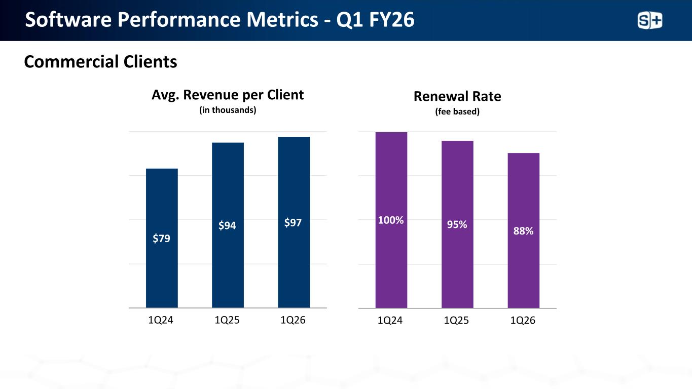 软件性能指标-Q1 FY26 $ 79 $ 94 $ 97 1Q24 1Q25 1Q26 avg。每客户收入(千)商业客户续费率(收费为主)100% 95% 88% 1Q24 1Q25 1Q26