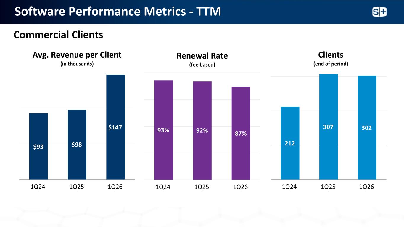 软件性能指标-TTM平均。每客户收入(千)续费率(基于费用)$ 93 $ 98 $ 147 1Q24 1Q25 1Q26 93% 92% 87% 1Q24 1Q25 1Q26 212307302 1Q24 1Q25 1Q26商业客户客户(期末)