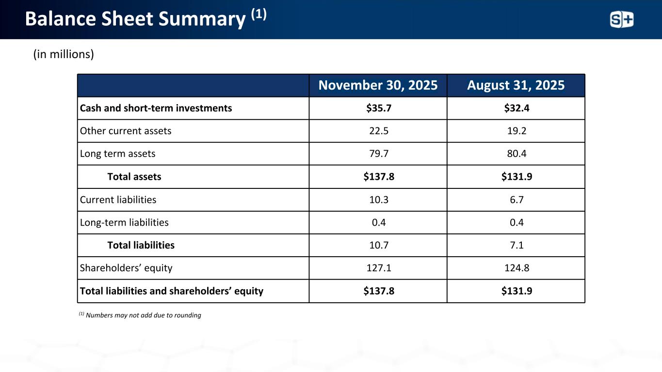 资产负债表摘要(1)(百万)(1)由于四舍五入,数字可能不会相加2025年11月30日2025年8月31日现金和短期投资$ 35.7 $ 32.4其他流动资产22.5 19.2长期资产79.78 0.4总资产$ 137.8 $ 131.9流动负债10.36.7长期负债0.4 0.4总负债10.77.1股东权益127.11 24.8总负债和股东权益$ 137.8 $ 131.9