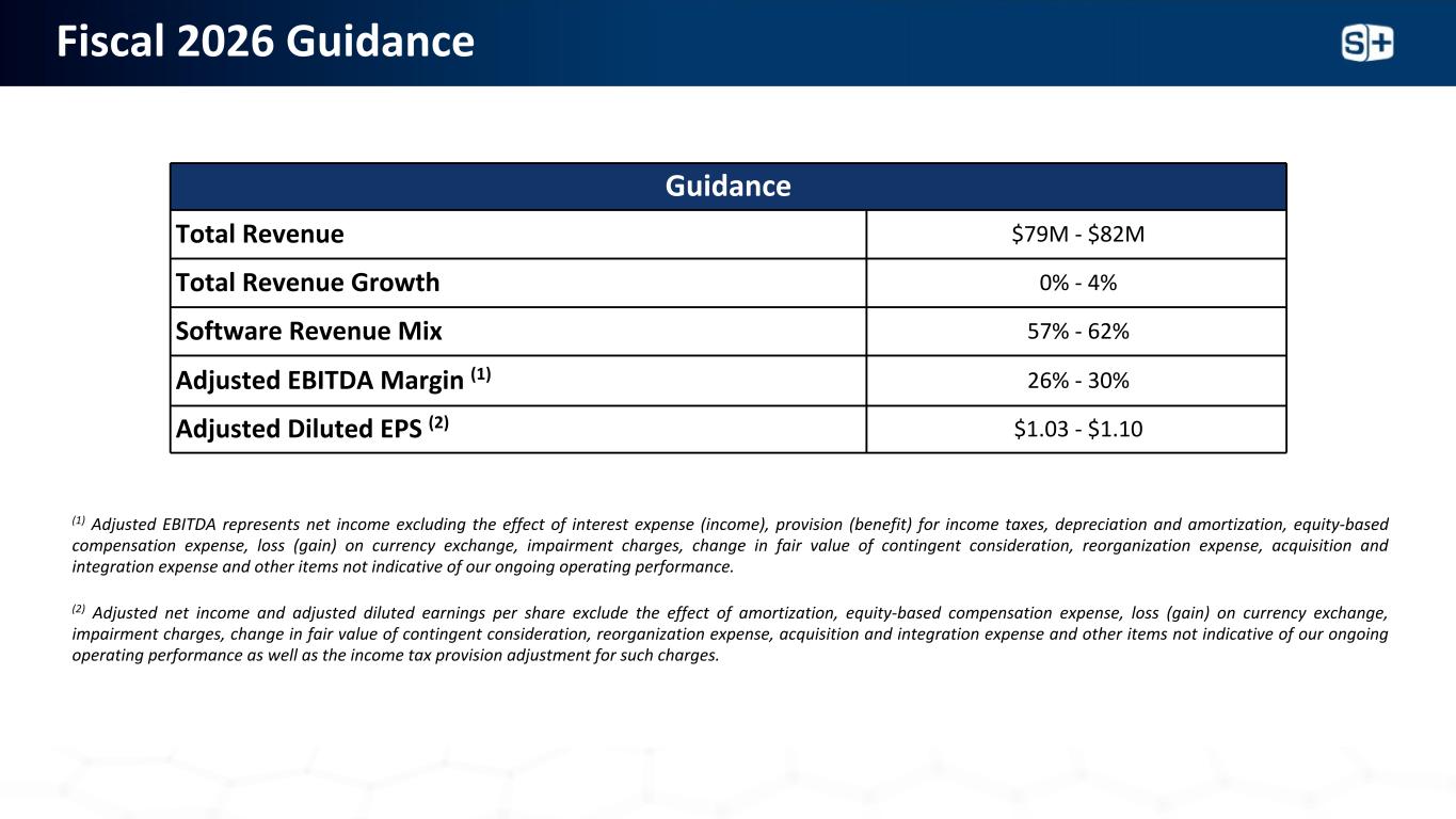 2026财年指导指导总收入7900万美元-8200万美元总收入增长0%-4 %软件收入组合57%-62 %调整后EBITDA利润率(1)26%-30 %调整后稀释后每股收益(2)1.03美元-1.10美元(1)调整后EBITDA指不包括利息费用(收入)、所得税拨备(收益)、折旧和摊销、股权补偿费用、汇兑损失(收益)、减值费用、或有对价公允价值变动、重组费用、收购和整合费用以及其他不表明我们持续经营业绩的项目的影响的净收入。(2)调整后的净收入和调整后的稀释每股收益不包括摊销、基于股权的补偿费用、汇兑损失(收益)、减值费用、或有对价公允价值变动、重组费用、收购和整合费用和其他不代表我们持续经营业绩的项目的影响以及此类费用的所得税拨备调整。