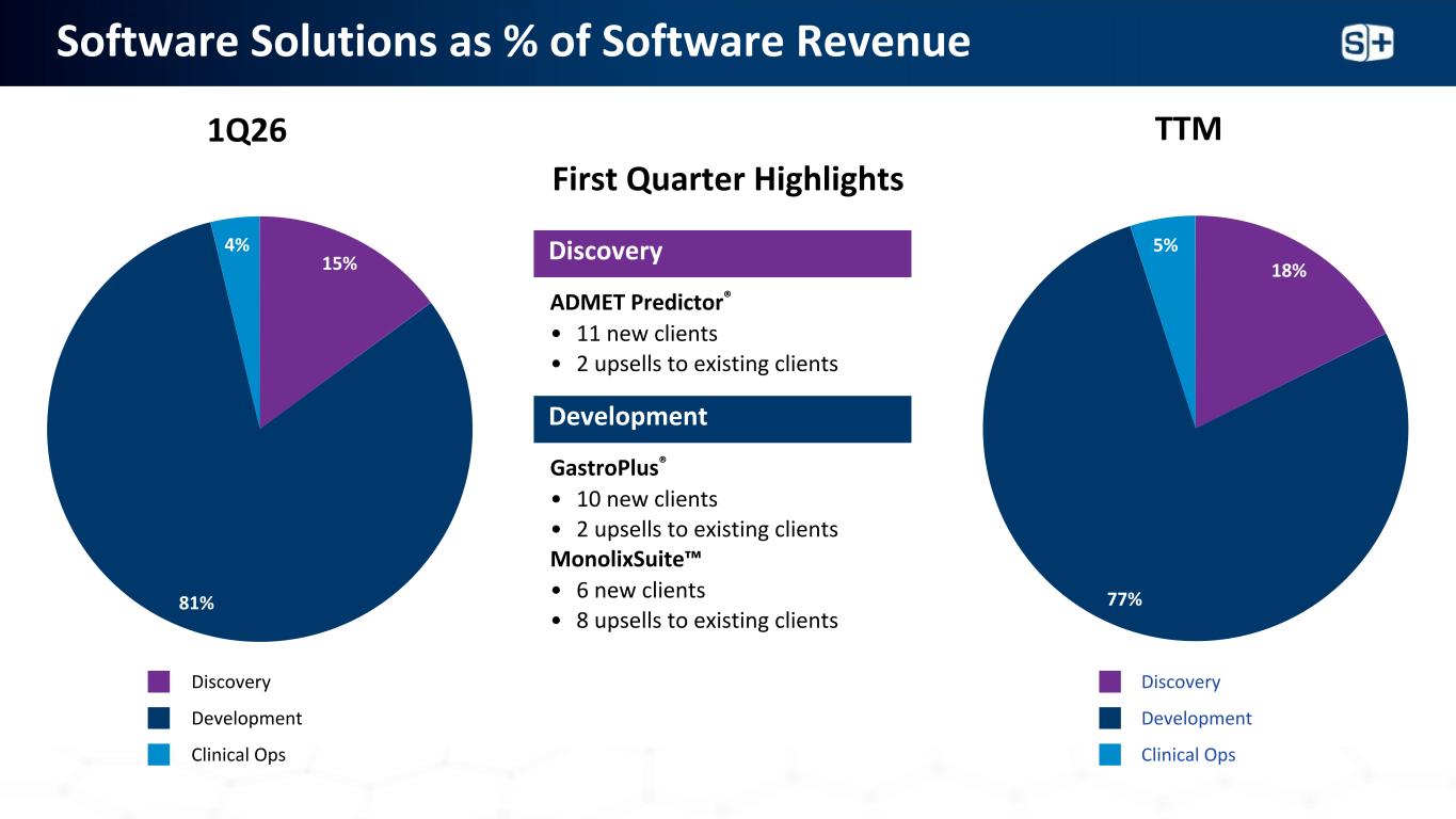 软件解决方案占软件收入的百分比15% 81% 4% 1Q26 18% 77% 5% TTM GastroPlus®• 10个新客户•向现有客户ADMET Predictor进行2次追加销售®• 11个新客户• 2个向现有客户追加销售MonolixSuite™• 6个新客户• 8个向现有客户追加销售第一季度亮点Discovery Development Discovery Development Clinical Ops Discovery Development Clinical Ops