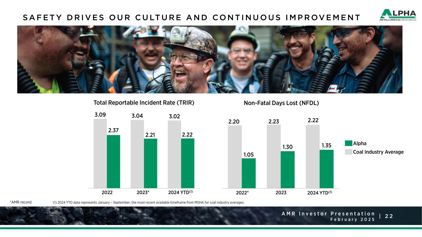 2 2A M R R A T I N G S A G E N C Y P R E S E N T A T I O N J A N U A R Y 2025 | A M R I N V E S T O R F E B R 3.09 3.04 3.02 2.37 2.21 2.22 20222023*2024年初至今(1)煤炭行业平均总可报告事故率(TRIR)2.20 2.23 2.22 1.05 1.30 1.35 2022*20232024年初至今(1)Non-Fatal Days Lost(NFDL)S A F E T Y D R I V E S OU R C U LT U R E A N D CO N T I N U O US I M P R OV E M E N T Alpha(1)2024年初至今的数据代表1月– 9月,这是MSHA提供的煤炭行业平均水平的最新时间框架。*AMR记录