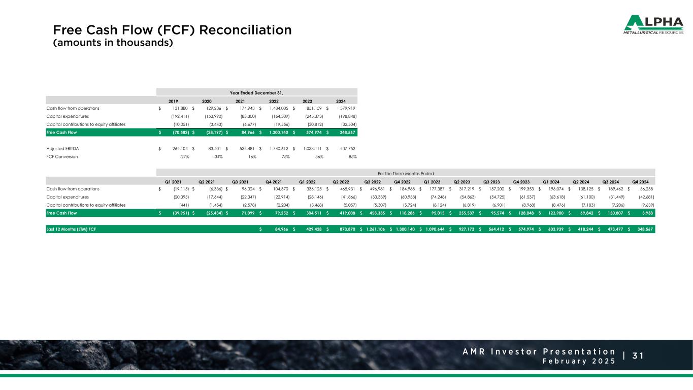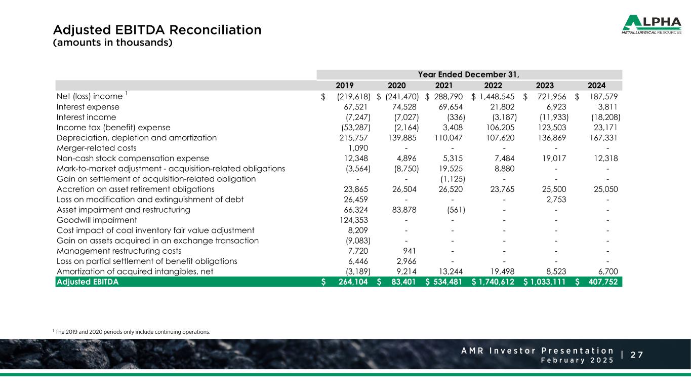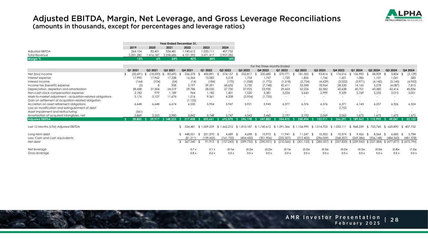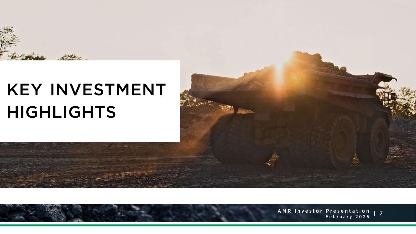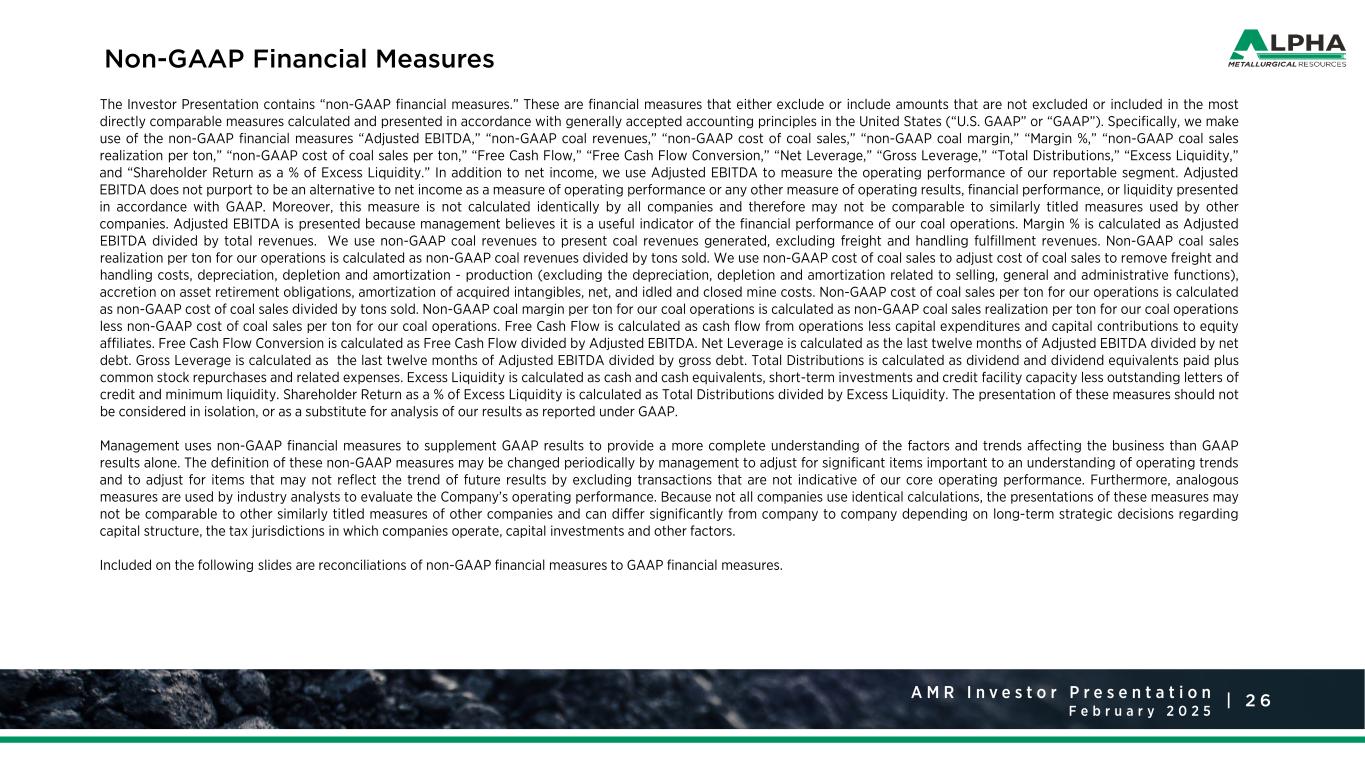 2 6A M R R A T I N G S A G E N C Y P R E S E N T A T I O N J A N U A R Y 2025 | A M R I N V E S T O R F E B R Non-GAAP财务指标投资者介绍中包含“非GAAP财务指标”。这些财务指标不包括或包括根据美国公认会计原则(“U.S. GAAP”或“GAAP”)计算和列报的最直接可比指标中未排除或包含的金额。具体而言,我们使用了非美国通用会计准则财务指标“调整后EBITDA”、“非美国通用会计准则煤炭收入”、“非美国通用会计准则煤炭销售成本”、“非美国通用会计准则煤炭利润率”、“利润率百分比”、“非美国通用会计准则每吨煤炭销售实现”、“非美国通用会计准则每吨煤炭销售成本”、“自由现金流”、“自由现金流转换”、“净杠杆”、“总杠杆”、“总分配”、“超额流动性”和“股东回报占超额流动性的百分比”。除净收入外,我们还使用调整后EBITDA来衡量我们可报告分部的经营业绩。调整后的EBITDA并不意味着可以替代作为经营业绩衡量标准或根据公认会计原则提出的任何其他经营业绩、财务业绩或流动性衡量标准的净收入。此外,这一衡量标准并非所有公司都以相同的方式计算,因此可能无法与其他公司使用的类似名称的衡量标准进行比较。提出调整后EBITDA是因为管理层认为这是衡量我们煤炭业务财务业绩的有用指标。Margin %的计算方法是调整后EBITDA除以总收入。我们使用非公认会计准则煤炭收入来表示产生的煤炭收入,不包括运费和装卸履行收入。我们业务的每吨非美国通用会计准则煤炭销售实现计算为非美国通用会计准则煤炭收入除以销售吨数。我们使用非美国通用会计准则煤炭销售成本来调整煤炭销售成本,以去除运费和装卸成本、折旧、损耗和摊销-生产(不包括与销售、一般和行政职能相关的折旧、损耗和摊销)、资产报废义务的增加、收购的无形资产的摊销、净额以及闲置和关闭的矿山成本。我们业务的每吨煤炭销售的非美国通用会计准则成本计算为煤炭销售的非美国通用会计准则成本除以销售的吨。我们煤炭业务的每吨非美国通用会计准则煤炭利润率计算为我们煤炭业务的每吨非美国通用会计准则煤炭销售实现数减去我们煤炭业务的每吨非美国通用会计准则煤炭销售成本。自由现金流的计算方法是运营现金流减去资本支出和对股权关联公司的出资。自由现金流转换的计算方法是自由现金流除以调整后的EBITDA。净杠杆的计算方法是最近十二个月的调整后EBITDA除以净债务。总杠杆的计算方法是最近十二个月的调整后EBITDA除以总债务。分配总额的计算方法是支付的股息和股息等价物加上普通股回购和相关费用。超额流动性按现金和现金等价物、短期投资和信贷额度减去未偿信用证和最低流动性计算。股东回报占超额流动性的百分比计算为总分配除以超额流动性。不应孤立地考虑这些措施的表述,也不应替代根据公认会计原则报告的对我们结果的分析。管理层使用非GAAP财务指标来补充GAAP业绩,以提供对影响业务的因素和趋势的更完整理解,而不是单独使用GAAP业绩。管理层可能会定期更改这些非公认会计原则措施的定义,以调整对理解经营趋势很重要的重要项目,并通过排除不代表我们核心经营业绩的交易来调整可能无法反映未来业绩趋势的项目。此外,行业分析师使用类似的衡量标准来评估公司的经营业绩。由于并非所有公司都使用相同的计算方法,这些措施的表述可能无法与其他公司的其他类似名称的措施进行比较,并且可能因公司而有很大差异,这取决于有关资本结构的长期战略决策、公司经营所在的税务管辖区、资本投资和其他因素。以下幻灯片中包含非GAAP财务指标与GAAP财务指标的对账。