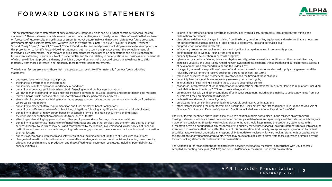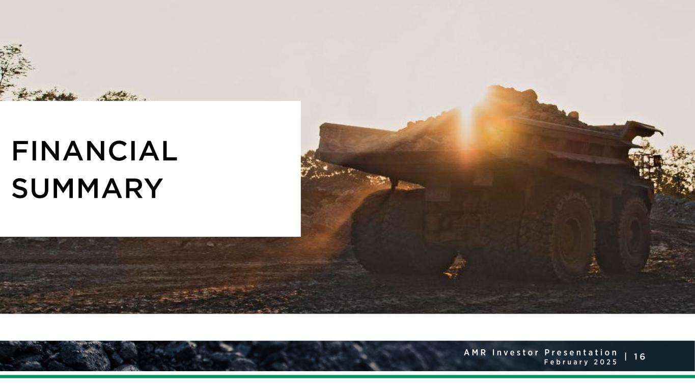 2A M R R A T I N G S A G E N C Y P R E S E N T A T I O N J A N U A R Y 2025 | A M R I N V E S T O F E B R F O R WA R D LO O K I N G S TAT E M E N T S本演示文稿包含对我们的期望、意图、计划和信念的陈述,构成“前瞻性陈述”。这些陈述涉及风险和不确定性,涉及基于对未来结果的预测和尚未确定的金额估计的分析和其他信息,也可能涉及我们的未来前景、发展和业务战略。我们在本演示文稿中使用了“预期”、“相信”、“可能”、“估计”、“预期”、“打算”、“可能”、“计划”、“预测”、“项目”、“应该”和类似的术语和短语,包括对假设的引用,来识别前瞻性陈述,但这些术语和短语并不是识别此类陈述的唯一方式。这些前瞻性陈述是基于对影响我们的未来事件的预期和信念做出的,并受到与我们的运营和商业环境相关的不确定性和因素的影响,所有这些都难以预测,其中许多超出了我们的控制范围,这可能导致我们的实际结果与这些前瞻性陈述中明示或暗示的结果存在重大差异。以下因素可能会导致实际结果与我们的前瞻性陈述产生重大差异:•低迷的煤炭价格水平或下跌;•公司的财务业绩;•我们的流动性、经营业绩和财务状况;•我们产生足够现金或获得融资为我们的业务运营提供资金的能力;•全球市场对煤炭和钢铁的需求,包括对美国煤炭出口的需求,以及煤炭市场的竞争;•铁路、驳船、卡车、港口和其他运输的可用性,业绩和成本;•钢铁和焦炭生产商从我们不经营的盆地转向天然气、可再生能源和煤炭等替代能源;•我们满足员工福利义务的抵押品要求并为其提供资金的能力;•我们在所需抵押品大幅增加后为我们的某些黑肺债务自行投保的能力;•我们以可接受的条款获得或续保担保债券或维持我们目前的担保状态的能力;•施加或延续贸易壁垒,例如关税;•吸引和留住关键人员和其他员工劳动力因素,例如劳动关系;•我们完成融资或再融资交易以及其他服务的能力,以及我们可以获得的这些服务的形式和程度,这可能会受到金融机构和保险公司有关碳能源生产商的贷款、投资和类似政策、煤炭燃烧的环境影响或其他因素的显着限制;•我们遵守健康和安全法规的成本,包括但不限于MSHA的二氧化硅法规;•国内或国际环境法律法规以及法院判决的变化,包括那些直接影响我们的煤炭开采和生产以及影响我们客户的煤炭使用的那些,包括潜在的气候变化倡议;•第三方承包商(包括合同采矿和复垦承包商)未能履行或不履行服务;•交付中断或第三方供应商改变我们运营所需的关键设备和材料的定价,例如柴油、钢铁产品、爆炸物,轮胎和购买的煤炭;•我们的生产能力和成本;•供应和劳动力的通胀压力以及商品价格的显着或快速上涨;•我们可能不时承担的债务;•我们执行股票回购计划的能力;•网络安全攻击或故障、对人身安全的威胁、极端天气条件或其他自然灾害;•由于乌克兰和中东及其周边地区的事态发展,全球市场、海运和我们的客户的波动性和不确定性增加;•变化、更新或收购,客户在煤炭供应安排下的条款和表现以及我们的客户拒绝根据商定的合同条款接收煤炭;•客户煤炭库存的减少或增加以及这些变化的时间安排;•我们获得、维持或更新任何必要许可或权利的能力;•煤炭开采的固有风险,包括我们无法控制的风险;•国内或国际税收或其他法律法规的变化、解释或实施,包括2022年《降低通胀法》及其相关法规;•我们与其他条件的关系以及影响,我们的客户, 包括如果我们的客户的信誉下降,无法从他们那里收取款项;•复垦和矿山关闭义务;•我们关于经济可采煤炭储量估计的假设;•其他因素,包括我们的10-K表格年度报告中包含的“风险因素”和“管理层对财务状况和运营结果的讨论和分析”部分中讨论的其他因素。上述确定的因素清单并非详尽无遗。我们提醒读者不要过分依赖任何前瞻性陈述,这些陈述基于我们目前可获得的信息,并且仅在作出这些陈述的日期发表。在考虑这些前瞻性陈述时,您应该牢记本演示文稿中的警示性陈述。我们不承担任何责任公开修改这些前瞻性陈述,以考虑到本演示文稿日期之后发生的事件或情况。此外,除联邦证券法明确要求外,我们不承担任何责任更新或修改任何前瞻性陈述或向您更新任何意外事件的发生,这可能导致实际结果与本演示文稿中包含的前瞻性陈述明示或暗示的结果不同。有关根据美国公认会计原则(“GAAP”)的财务指标与本演示文稿中使用的非GAAP财务指标之间差异的调节,请参见附录B。
