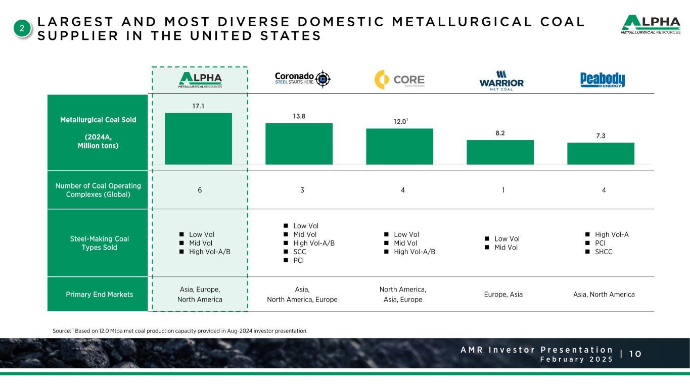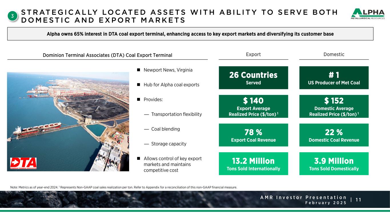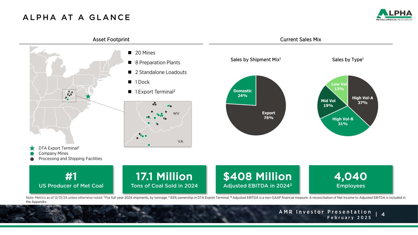 1 1A m r r r r r r r r r r r r r r r r r r r r r r r r r r r r r r r r r r r r r r r r r r r r r r r r r r r r r r r r r r r r r r r r r r r r r r r r r r r r r r r r r r r r r r r r r r r r r r r r r r r r r r r r r r r r r r r r r r r r r r r r r r r r r r r r r r r r r r r r r r r r r r r r r r r r r r rT I C A N D E X P O R T M A R K E T S 3注:截至2024年底的指标。1代表每吨非美国通用会计准则煤炭销售实现。有关这一非GAAP财务指标的调节,请参阅附录。22%国内煤炭收入78%出口煤炭收入$ 152国内平均实现价格(美元/吨)1 $ 140出口平均实现价格(美元/吨)1 Dominion Terminal Associates(DTA)煤炭出口终端出口国内# 1 Met Coal 26 countries的美国生产商服务390万吨国内销售1320万吨国际销售Alpha拥有DTA煤炭出口终端65%的权益,增强了进入关键出口市场的机会,并使其客户群多样化Newport News,Alpha煤炭出口的Virginia Hub提供:—运输灵活性—配煤—储存能力允许控制关键出口市场并保持具有竞争力的成本