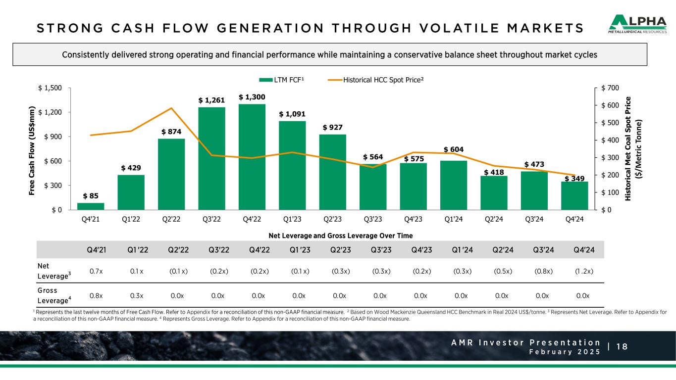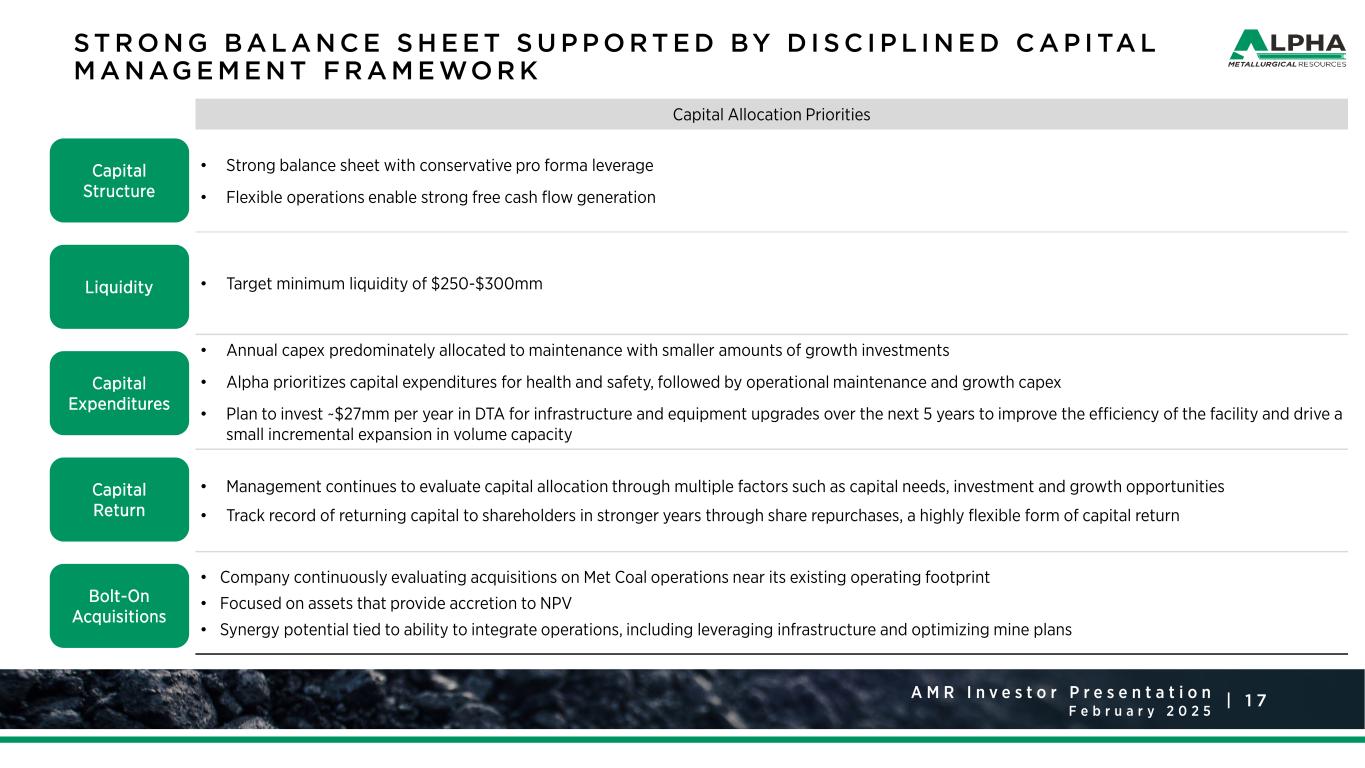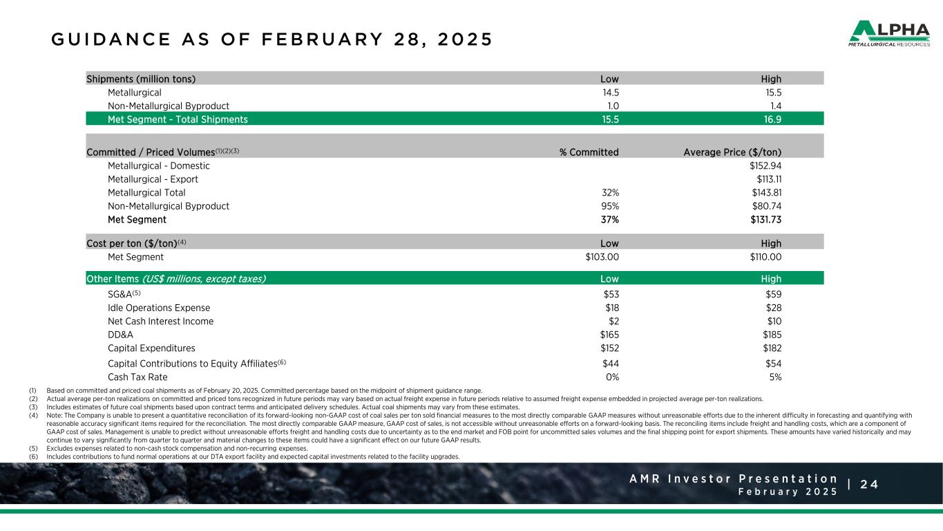 2 4A M R R A T I N G S A G E N C Y P R E S E N T A T I O N J A N U A R Y 2025 | A M R I N V E S T O R F E B R(1)基于截至2025年2月20日的承诺和定价煤炭发运量。承诺百分比基于发货指导范围的中点。(2)在未来期间确认的承诺和定价吨的实际平均每吨实现可能会根据未来期间的实际运费费用相对于嵌入在预计平均每吨实现中的假定运费费用而有所不同。(3)包括根据合同条款和预期交付时间表对未来煤炭发运量的估计。实际煤炭发运量可能与这些估计数有所不同。(4)注:公司无法在没有不合理努力的情况下将其前瞻性非公认会计原则的每吨销售煤炭销售成本财务指标与最直接可比的公认会计原则指标进行量化对账,原因是难以以合理的准确性预测和量化对账所需的重要项目。最直接可比的GAAP衡量标准,GAAP销售成本,如果没有前瞻性的不合理努力,是无法获得的。调节项目包括运费和装卸费,这是GAAP销售成本的组成部分。由于未承诺销量的终端市场和离岸点以及出口发货的最终发运点的不确定性,管理层无法在不做出不合理努力的情况下预测运费和装卸成本。这些金额在历史上有所不同,每个季度可能会继续有很大差异,这些项目的重大变化可能会对我们未来的GAAP业绩产生重大影响。(5)不包括与非现金股票补偿相关的费用和非经常性费用。(6)包括为我们的DTA出口设施的正常运营提供资金的捐款以及与设施升级相关的预期资本投资。G U I DA N C E A S O F F E B R UA RY 28,2025出货量(百万吨)低高冶金14.5 15.5非冶金副产品1.0 1.4 Met段-总出货量15.5 16.9承诺/定价量(1)(2)(3)%承诺平均价格(美元/吨)冶金-国内152.94美元冶金-出口113.11美元冶金总额32% 143.81美元非冶金副产品95% 80.74美元Met段37% 131.73美元每吨成本(美元/吨)(4)低高Met段103.00美元110.00美元其他项目(百万美元,税除外)低高SG & A(5)$ 53 $ 59闲置运营费用$ 18 $ 28净现金利息收入$ 2 $ 10 DD & A $ 165 $ 185资本支出$ 152 $ 182对股权关联公司的资本贡献(6)$ 44 $ 54现金税率0% 5%