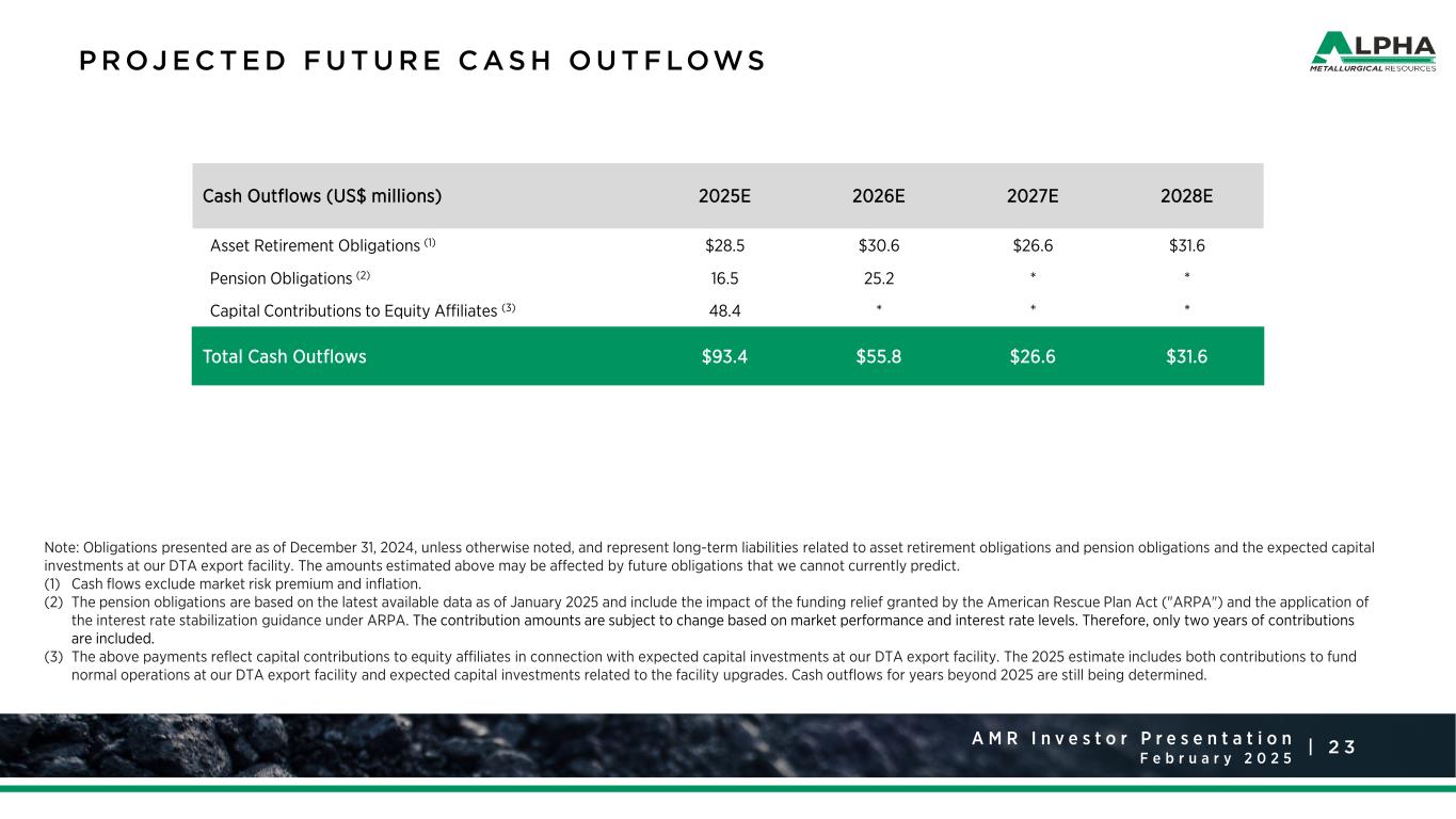 2 3A M R R A T I N G S A G E N C Y P R E S E N T A T I O N J A N U A R Y 2025 | A M R I N V E S T O F E B R P R O J E C T E D F U T U R E C as H O U T F LOWS注:除非另有说明,否则呈列的债务截至2024年12月31日,并代表与资产报废义务和养老金义务相关的长期负债以及我们DTA出口设施的预期资本投资。上述估计的金额可能会受到我们目前无法预测的未来义务的影响。(1)现金流剔除市场风险溢价和通胀。(2)养老金义务基于截至2025年1月的最新可用数据,包括美国救援计划法案(“ARPA”)授予的资金减免以及ARPA下利率稳定指导的应用的影响。供款金额可能会根据市场表现和利率水平而发生变化。因此,只包括两年的捐款。(3)上述付款反映了就我们的DTA出口设施的预期资本投资向股权关联公司提供的出资。2025年的估计数既包括为我们的DTA出口设施的正常运营提供资金的捐款,也包括与设施升级相关的预期资本投资。2025年以后年份的现金流出仍在确定中。现金流出(百万美元)2025E 2026E 2027E 2028E资产退休债务(1)$ 28.5 $ 30.6 $ 26.6 $ 31.6养老金债务(2)16.525.2**对股权附属公司的出资(3)48.4***现金流出总额$ 93.4 $ 55.8 $ 26.6 $ 31.6