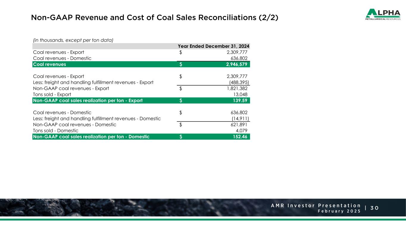 2 9A M R R A T I N G S A G E N C Y P R E S E N T A T I O N J A N U A R Y 202 | A M R I N V E S T O R F E B R Non-GAAP收入和成本煤炭销售对账(1/2)12021年期间重新分类,将已终止经营业务重新分类,并将持续经营业务中的相关金额作为所有其他类别的一部分列报。(以千为单位,吨数据除外)2019202020211202220232024煤炭收入1,995,934美元1,413,124美元2,252,624美元4,092,987美元3,456,630美元2,946,579美元减:运费和装卸履行收入(276,182)(219,449)(380,977)(529,063)(439,010)(503,306)非美国通用会计准则煤炭收入1,719,752美元1,193,675美元1,871,647美元3,563,924美元3,017,620美元2,443,273美元吨销售17,15215,51316,83916,37817,07217,127非美国通用会计准则煤炭销售实现每吨100.27美元76。和关闭的矿山成本(14,565)(28,880)(26,578)(28,557)(26,998)(29,868)减:煤炭库存公允价值调整的成本影响(8,209)-----非美国通用会计准则煤炭销售成本1,368,812美元1,032,682美元1,270,227美元1,728,349美元1,890,130美元1,918,427美元吨售出17,15215,51316,83916,37817,07217,127吨煤炭销售成本79.80美元66.57美元75.43美元105.53美元110.72美元112.01美元非美国通用会计准则煤炭利润率350,940美元160,993美元601,420美元1,835,575美元1,127,490美元524