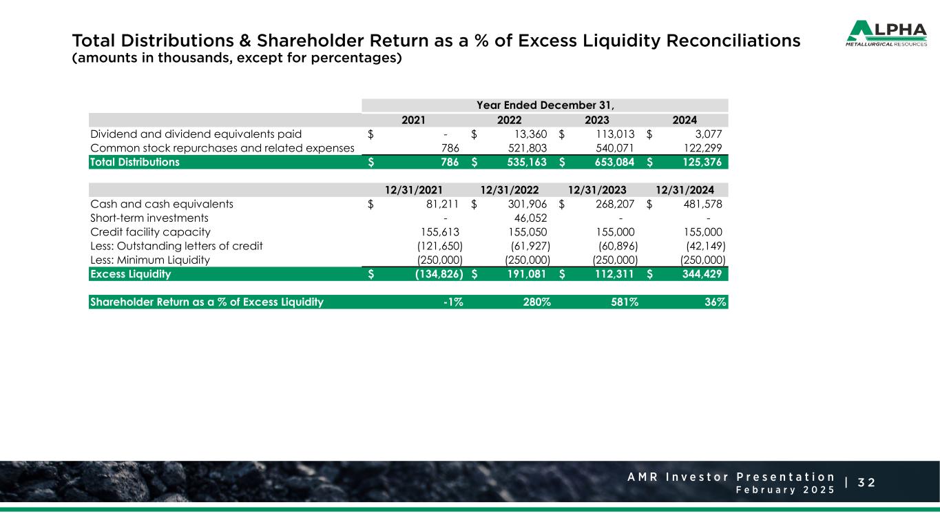3 2A M R R A T I N G S A G E N C Y P R E S E N T A T I O N J A N U A R Y 2025 | A M R I N V E S T O R F E B R总分配&股东回报占超额流动性调节的百分比(以千为单位,百分比除外)2021202220232024支付的股息和股息等价物-$ 13,360 $ 113,013 $ 3,077 $普通股回购和相关费用786521,803540,071122,299总分配786 $ 535,163 $ 653,084 $ 125,376 $ 12/31/202112/31/202212/31/202312/31/2024现金和现金等价物81,211 $ 301,906 $ 268,207 $ 481,578 $短期投资-46,052--信贷额度155,613155,050155,000155,000减:未结信用证(121,650)(61,927)(60,896)(42,149)减:最低流动性(250,000)(250,000)(250,000)(250,000)超额流动性(134