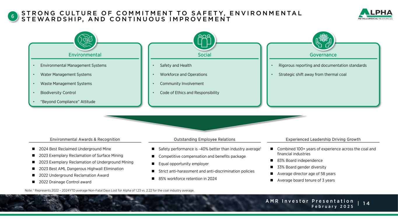 5A M R R A T I N G S A G E N C Y P R E S E N T A T I O N J A N U A R Y 2025 | A M R I N V E S T O R F E B R S A F E T Y,E N V I R O N M E N TA L AWA R E N E S A N D A C O M M I T M E N T O C O N U O US I M P R O V E M E N T – E S S E N T I A L C O M P O N E N T S O F B US I N E S E X C E L E N C E注:1见附录有关Alpha关键安全统计与煤炭行业平均水平的更多详细信息。2016年以来植树2棵。总可报告事故率较行业平均低~26%。1~40%非致命损失天数较行业平均低。1 372024年安全和矿山救援奖530万棵树种植2 25 +环境合规奖99.9% +水质合规率安全生产我们相信安全和合乎道德的运营。每个员工都有权消除有风险的行为。环境管理我们开展采矿业务的重点是环境管理和对环境保护的承诺。