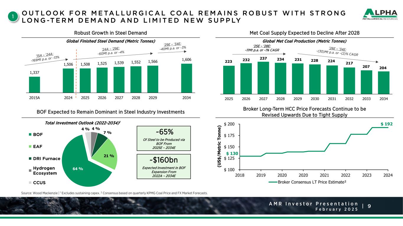 9A M R R A T I N G S A G E N C Y P R E S E N T A T I O N J A N U A R Y 2025 | A M R I N V E S T O R F E B R 223232323723423122822421720720420252026202720282029203020312032203320341,3371,5061,5081,5251,5391,5521,5661,606 2015A 2024202520262027202820292034资料来源:Wood Mackenzie | 1不包括维持资本支出。2基于季度毕马威煤炭价格和外汇市场预测的共识。1钢铁需求强劲增长全球成品钢需求(公吨)BOF预计仍将在钢铁行业占主导地位投资符合2028年后煤炭供应预计下降的预期~65%的钢铁将从2025年起通过BOF生产~1600亿美元预计2022年起BOF扩建投资A – 2034E经纪商长期HCC价格预测继续上调,原因是供应紧张总投资展望(2022-2034)14% 7% 21% 64% 4%‘25E –’28E:~11mt p.a。或~1% CAGR全球Met煤炭产量(公吨)$ 130 $ 192 $ 100 $ 125 $ 150 $ 175 $ 200201820192020202020212021202220232024(US $/M et ri c to nn e)Broker Consensus LT Price Estimate ² BOF EAF丨DRI炉氢生态系统CCUS O U T LO O K F O R M E TA L U R G I C A L C OA L R E M A I N S R O B U T W I T H S T R O N G LON G-T E R M D E M A N D A N D L I M I T E D N E W S U P P LY
