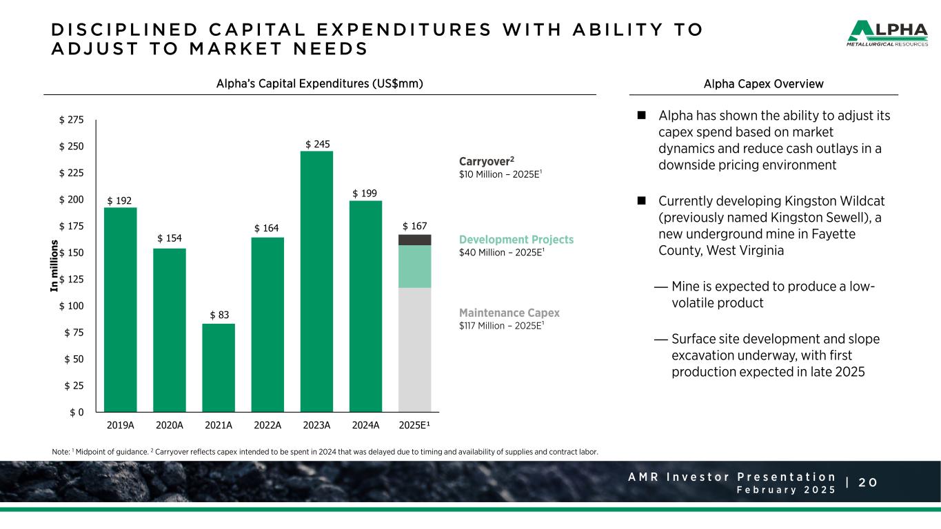 2 0A m r r r r r r r r r r r r r r r r r r r r r r r r r r r r r r r r r r r r r r r r r r f e b r d r r r r r f e b r d r r r f e b r d r r f e b r d r r f e b r d r r f e b r d r f f e b r d r f f e b r d r f f f f f f f f f f f f f f f f f f f f f f f f f f f f f f f f f f f f f f f f f f f f f f f f f fT to M A R K E T N E E D S Alpha的资本支出(美元mm)Alpha资本支出概览Alpha已显示出根据市场动态调整其资本支出支出并在下行定价环境中减少现金支出的能力,目前正在开发位于西弗吉尼亚州费耶特县的新地下矿山Kingston Wildcat(以前名为Kingston Sewell)——矿山预计将生产一种低挥发性产品——地表场地开发和斜坡挖掘正在进行中,预计将于2025年底首次生产注:1指导中点。2结转反映了由于供应和合同劳动力的时间和可用性而推迟的打算在2024年支出的资本支出。结转2.10百万美元– 2025E丨维护资本支出1.17亿美元– 2025E丨开发项目0.4亿美元– 2025E丨192美元154美元83美元164美元245美元199美元167美元0美元25美元50美元75美元100美元125美元150美元175美元200美元225美元250美元275美元2019A 2020A 2021A 2022A 2023A 2024A 2025E丨in m ill io ns