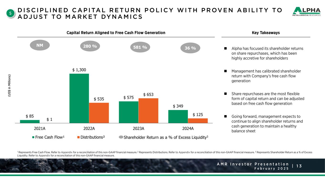 1 3a m r r r r r r r r r r r r r r r r r r r r r r r r r r r r r r r r r r r r r r r r r r r r r r r r r r r f e b r d r r r r r r r r r f e b r d r r r r r r r f e b r d r r r r r r r r r r r r r r r r r r r r r r r r r r r r r r r r r r r r r r r r r r r r r r r r r r r r r r r r r r r r r r r r r r r r r r r r r r r r r r r r r r r r r r r r r r r r r r r r rto a DJ US T to M A R K E T DY N A M I C S 51代表自由现金流。有关这一非GAAP财务指标的调节,请参阅附录。2代表分配。有关这一非GAAP财务指标的调节,请参阅附录。3表示股东回报占超额流动性的百分比。有关这一非GAAP财务指标的调节,请参阅附录。Alpha已将其股东回报集中在股份回购上,这对股东具有很高的增值作用,管理层已将股东回报与公司的自由现金流产生进行了校准。股份回购是最灵活的资本回报形式,可以根据自由现金流的产生进行调整,管理层预计将继续使股东回报和现金产生保持一致,以保持健康的资产负债表关键要点资本回报与自由现金流产生一致(美元,按百万美元计)85美元1,300美元575美元349美元1美元535美元653美元125美元2021A 2022A 2023A 2024A自由现金流丨分配²股东回报占超额流动性的百分比3280% NM 581% 36%