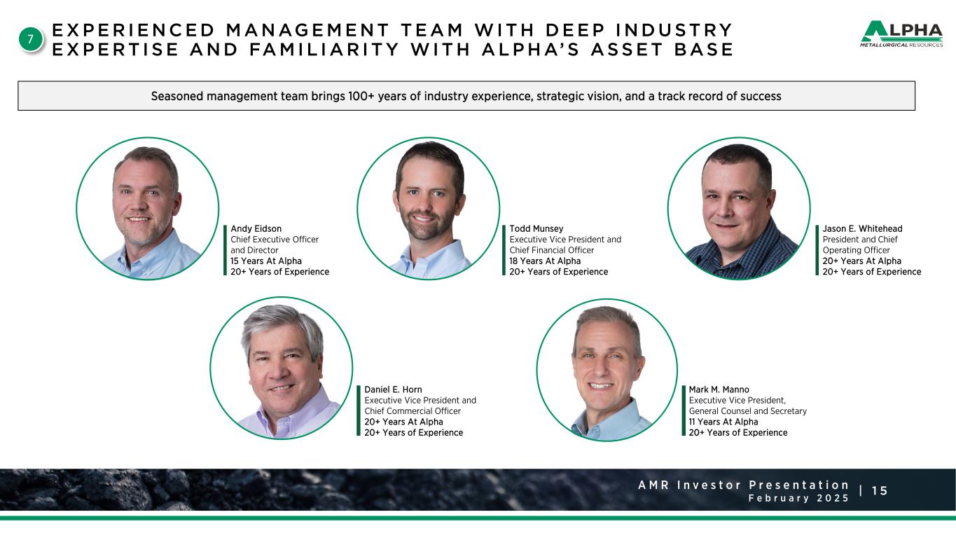 1 4A m r r r r r r r r r r r r r r r r r r r r r r r r r r r r r r r r r r r r r r r r r r r r r r r r r r r r r r r r r r r r r r r r r r r r r r r r r r r r r r r r r r r r r r r r r r r r r r r r r r r r r r r r r r r r r r r r r r r r r r r r r r r r r r r r r r r r r r r rE N V I R O N M E N TA L S T E WA R D S H I P,A N D C O N T I N U O US I M P R O V E M E N T6环境•环境管理系统•水管理系统• 美国废物管理系统•生物多样性控制•“超越合规”态度社会•安全与健康•劳动力和运营•社区参与• Code of Ethics和责任治理•严格报告和文件标准•战略转向远离动力煤环境奖&表彰2024年最佳回收地下矿山2023年示范性回收露天采矿2023年示范性回收地下采矿2023年最佳AML危险高墙消除2022地下回收奖2022年排水控制奖杰出员工关系经验丰富的领导力推动增长安全绩效比行业平均水平高出约40% 1有竞争力的薪酬和福利包平等机会雇主严格的反骚扰和反歧视政策2024年85%的劳动力保留率加起来100 +年的煤炭领域经验金融行业83%董事会独立性33%董事会性别多样性平均董事年龄58岁平均董事会任期3年注:1代表2022 – 2024年年初至今的平均非致命天数损失的Alpha为1.23,而煤炭行业平均为2.22。