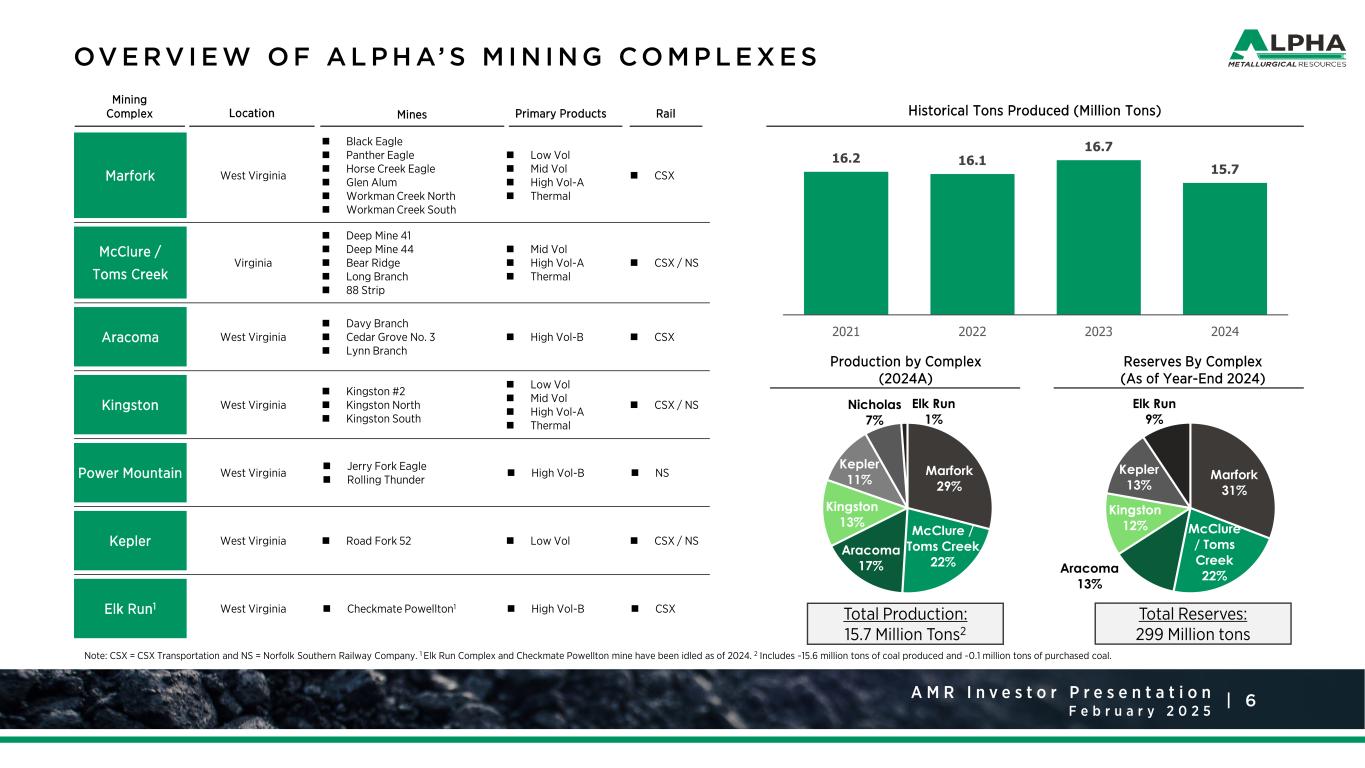 6a m r r r r r r r r r r r r r r r r r r r r r r r r r r r r r r r r r r r r r r r r r r r r r r r r r r r r r r r r r r r r r r r r r r r r r r r r r r r r r r r r r r r r r r r r r r r r r r r r r r r r r r r r r r r r r r r r r r r r r r r r r r r r r r r r r r r r r r r r r r r r r r r r r r r r r r rGlen Alum Workman Creek North Workman Creek South Low Vol Mid Vol High Vol-A Thermal CSX McClure/Toms Creek Virginia Deep Mine 41 Deep Mine 44 Bear Ridge Long Branch 88 Strip Mid Vol High Vol-A Thermal TERM0/NS Aracoma West Virginia Davy Branch Cedar Grove No. 3 Lynn Branch High Vol-B 丨CSX Kingston West Virginia Kingston # 2 Kingston North Kingston South Low Vol Mid Vol High Vol-A ThermalCSX/NS Power Mountain West Virginia Jerry Fork Eagle Rolling Thunder High Vol-B NS Kepler West Virginia Road Fork 52 Low Vol CSX/NS Elk Run1 West Virginia Checkmate Powellton1 High Vol-B CSX Primary Products Mines注:TERM0 CSX CSX = CSX运输,NS = 诺福克南方铁路公司。截至2024年,1座Elk Run Complex和Checkmate Powellton矿已闲置。2包括生产煤炭~1560万吨和外购煤炭~10万吨。历史产量吨(百万吨)储量按综合体(截至2024年底)产量按综合体(2024A)总储量:2.99亿吨总产量:1570万吨2 Marfork 31% McClure/Toms Creek 22% Aracoma 13% Kingston 12% Power Mountain 0% Kepler 13% Elk Run 9% 16.2 16.1 16.7 15.7 2021202220232024 Marfork 29% McClure/Toms Creek 22% Aracoma 17% Kingston 13% Kepler 11% Nicholas 7% Elk Run 1%