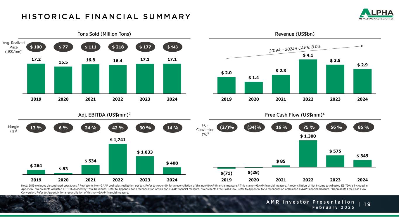 1 9A M R R A T I N G S A G E N C Y P R E S E N T A T I O N J A N U R Y 2025 | A M R I N V E S T O R F E B R H I S T O R I C A L F I N A N C I A L S U M A RY吨销量(百万吨)收入(十亿美元)调整后EBITDA(美元mm)2自由现金流(美元mm)4平均。实现价格(美元/吨)1注:2019年不包括已终止经营业务。1代表每吨非美国通用会计准则煤炭销售实现。有关这一非GAAP财务指标的调节,请参阅附录。2这是一项非公认会计准则财务指标。净收入与调整后EBITDA的对账包含在附录中。3表示调整后EBITDA除以总收入。有关这一非GAAP财务指标的调节,请参阅附录。4代表自由现金流。有关这一非GAAP财务指标的调节,请参阅附录。5代表自由现金流转换。有关这一非GAAP财务指标的调节,请参阅附录。保证金(%)3 FCF折算(%)517.2 15.5 16.8 16.41 7.11 7.1 201920202021202220232024 $ 100 $ 177 $ 218 $ 111 $ 77 $ 143 $ 2.0 $ 1.4 $ 2.3 $ 4.1 $ 3.5 $ 2.9 2019202020202021202220232024 $ 264 $ 83 $ 534 $ 1,741 $ 1,033 $ 408201920202021202220232024 13% 30% 42% 24% 6% 14% $(71)$(28)$ 85 $ 1,300 $ 575 $ 349201920202021202220232024(27)% 56% 75% 16%(34)% 85%