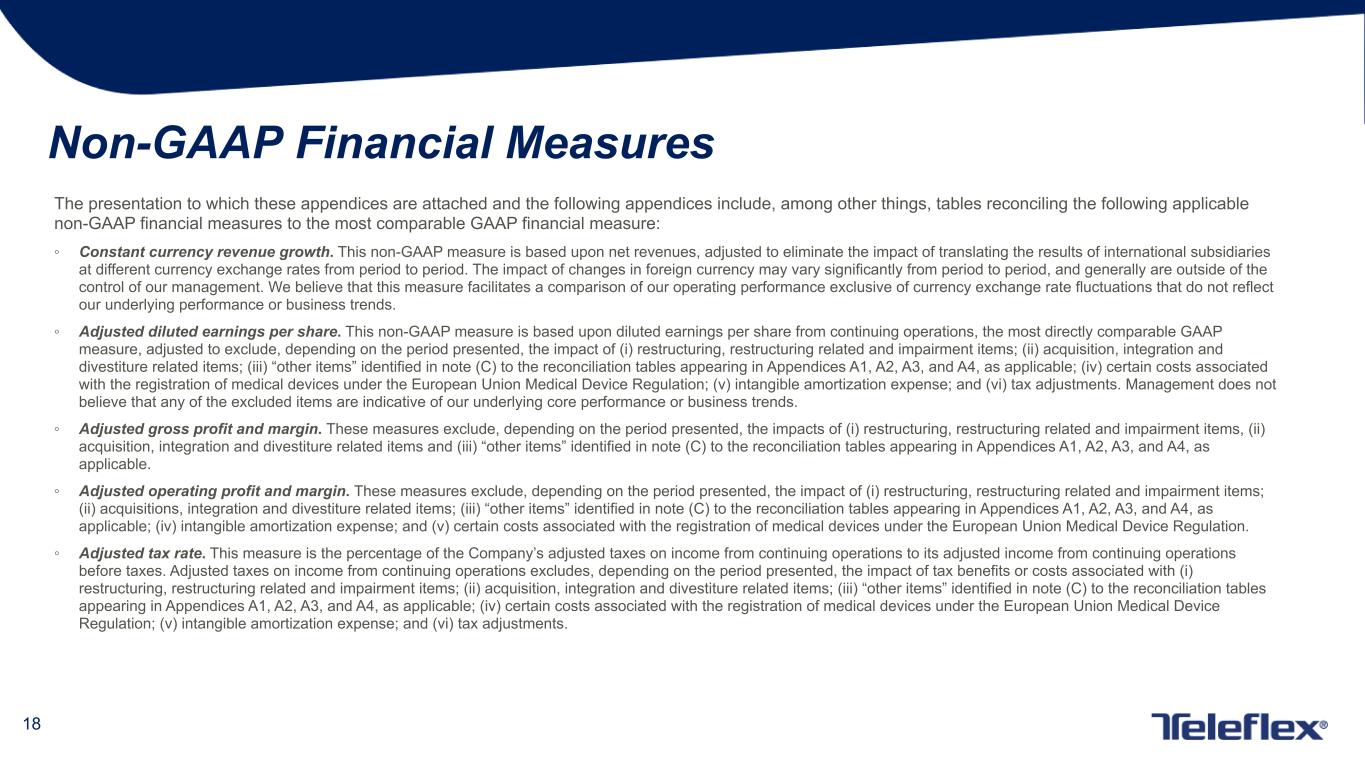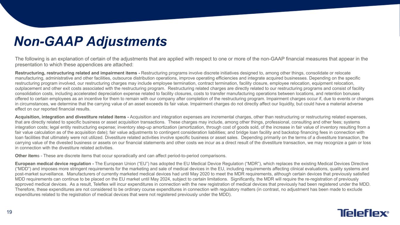 19非公认会计原则调整。以下是对这些附录所附的列报中出现的一项或多项非公认会计原则财务措施所适用的某些调整的解释:重组,重组相关项目和减值项目----重组方案涉及离散举措,这些举措旨在整合或搬迁制造、行政和其他设施,将分销业务外包,提高运营效率,并整合收购的业务。根据所涉及的具体重组计划,我们的重组费用可能包括与重组计划相关的员工解雇、合同终止、设施关闭、员工搬迁、设备搬迁、安置和其他退出费用。与重组有关的费用与我们的重组方案直接相关,包括设施合并费用,包括与设施关闭有关的加速折旧费用、在不同地点之间转移制造业务的费用,以及向某些员工提供的留任奖金,以激励他们在重组计划完成后继续留在我们公司。如果由于事件或情况的变化,我们确定某项资产的账面价值超过其公允价值,则会产生减值费用。减值费用不直接影响我们的流动性,但可能对我们报告的财务业绩产生重大不利影响。收购、整合和剥离相关项目----收购和整合费用是与特定业务或资产收购交易直接相关的除重组或重组相关费用之外的增量费用。这些费用除其他外,可包括专业、咨询和其他费用;系统整合费用;法人机构重组费用;库存增加摊销(通过销售商品的成本摊销,按截至购买日的公允价值计算导致的存货公允价值增加);或有对价负债的公允价值调整;与最终未使用的贷款融资有关的过渡贷款融资和后援融资费用。与资产剥离相关的活动涉及特定的业务或资产出售。主要取决于剥离交易的条款、剥离业务或资产在我们财务报表上的账面价值以及我们因剥离交易直接产生的其他成本,我们可能会确认与剥离相关活动有关的收益或损失。其他项目-这些是零星发生的离散项目,可能会影响期间间的比较。欧洲医疗器械条例----欧洲联盟(“欧盟”)通过了《欧盟医疗器械条例》(“MDR”),该条例取代了现行的《医疗器械指令》(“MDD”),并对在欧盟销售和销售医疗器械提出了更严格的要求,包括影响临床评价的要求,质量体系和上市后监督。目前已上市的医疗设备制造商必须在2020年5月之前满足MDR要求,但某些以前满足MDD要求的设备可以继续在欧盟市场上销售到2024年5月,但受到某些限制。重要的是,MDR将要求对先前批准的医疗器械进行重新注册。因此,Teleflex将在新的医疗器械注册方面产生支出,这些医疗器械以前是在MDD下注册的。因此,这些支出不被视为与管理事项有关的普通课程支出(相比之下,未作调整以排除与先前未在千年发展目标下登记的医疗器械登记有关的支出)。