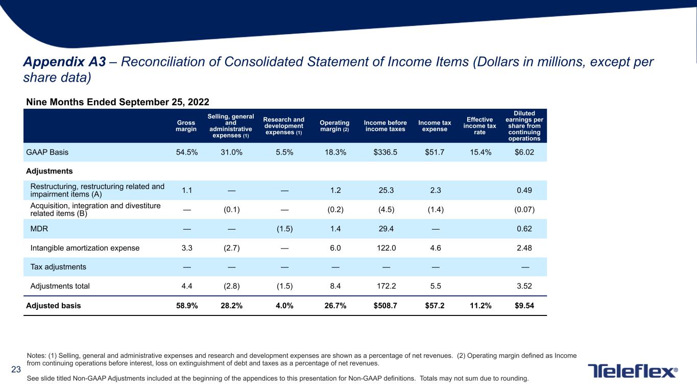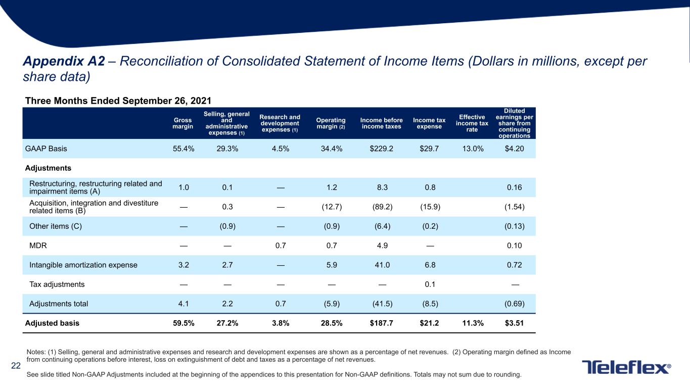 21注:(1)销售、一般和管理费用以及研究和开发费用按净收入的百分比列示。(2)营业利润率定义为扣除利息、债务清偿损失和税收之前的持续经营收入占净收入的百分比。请参阅本演示文稿附录开头的标题为Non-GAAP调整的幻灯片,了解Non-GAAP定义。由于四舍五入,总数可能不相加。附录A1 –合并损益表项目的调节(百万美元,每股数据除外)截至2022年9月25日的三个月销售毛利率,一般和管理费用(1)研发费用(1)营业利润率(2)所得税前收入所得税费用实际所得税率持续经营业务每股摊薄收益GAAP基础54.4% 30.5% 5.5% 19.3% $ 119.2 $ 17.31 4.5% $ 2.16调整重组,重组相关和减值项目(A)1.0 — 1.17.5 0.5 0.15收购,一体化与资产剥离有关的项目(B)—(0.2)—(0.8)(5.2)(1.4)(0.08)MDR —(1.3)1.38.8 — 0.19无形资产摊销费用3.3(2.6)— 6.04 0.9 1.5 0.83税收调整————(1.1)0.02调整数合计4.3(2.8)(1.3)7.65 2.0(0.5)1.11调整基础58.7% 27.7% 4.2% 26.9% $171.2 $16.8 9.8% $3.27