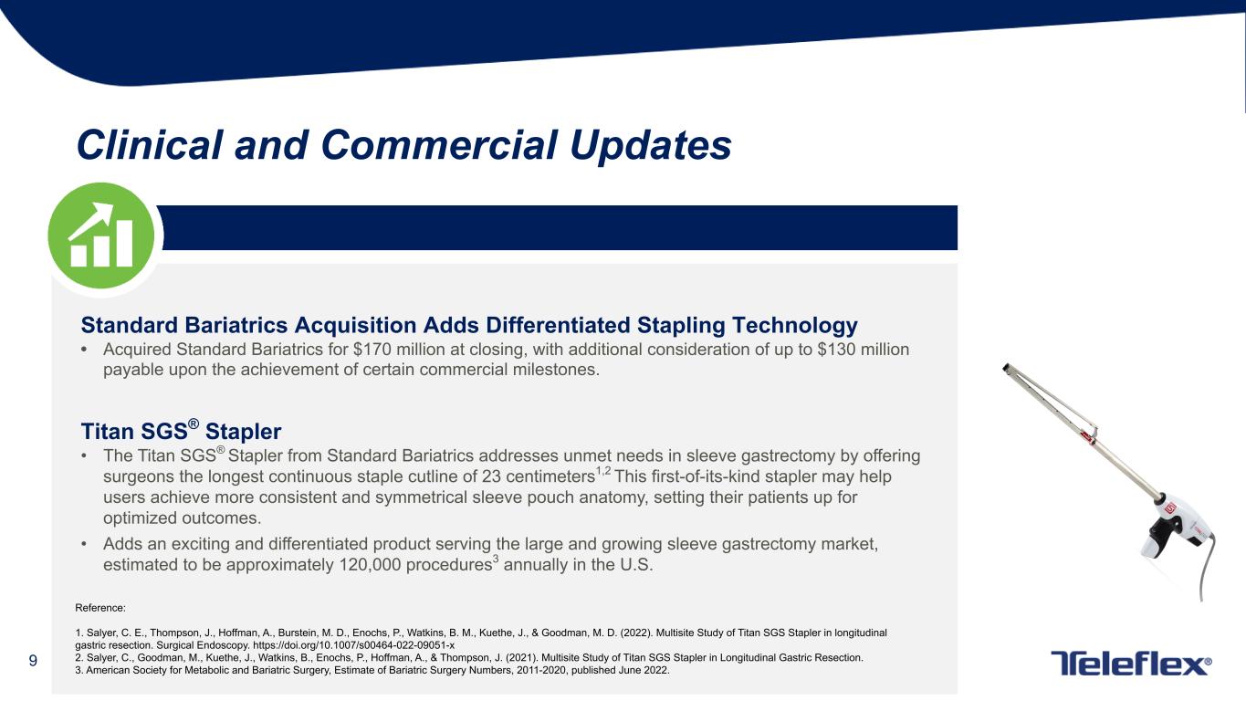 9临床和商业更新标准减肥药收购增加了差异化的缝合技术•在交易结束时以1.7亿美元收购标准减肥药,在达到某些商业里程碑时支付最多1.3亿美元的额外对价。Titan SGS ®吻合器• Standard Bariatrics的Titan SGS ®吻合器通过为外科医生提供23厘米的最长连续缝合线,满足了袖状胃切除术中未满足的需求1,2这种首创的吻合器可帮助用户实现更一致和对称的袖状囊解剖结构,为他们的患者提供优化的结果。•增加了一个令人兴奋和差异化的产品,服务于庞大且不断增长的袖状胃切除术市场,估计美国每年约有120,000例手术3参考:1。Salyer,C. E.,Thompson,J.,Hoffman,A.,Burstein,M. D.,Enochs,P.,Watkins,B. M.,Kuethe,J.和Goodman,M. D.(2022年)。Titan SGS吻合器在纵向胃切除中的多部位研究。外科内窥镜。https://doi.org/10.1007/s00464-022-09051-x 2。Salyer,C.,Goodman,M.,Kuethe,J.,Watkins,B.,Enochs,P.,Hoffman,A.和Thompson,J.(2021年)。Titan SGS吻合器在纵向胃切除中的多点研究。3.美国代谢和减肥手术学会,《2011-2020年减肥手术数量估计》,2022年6月出版。