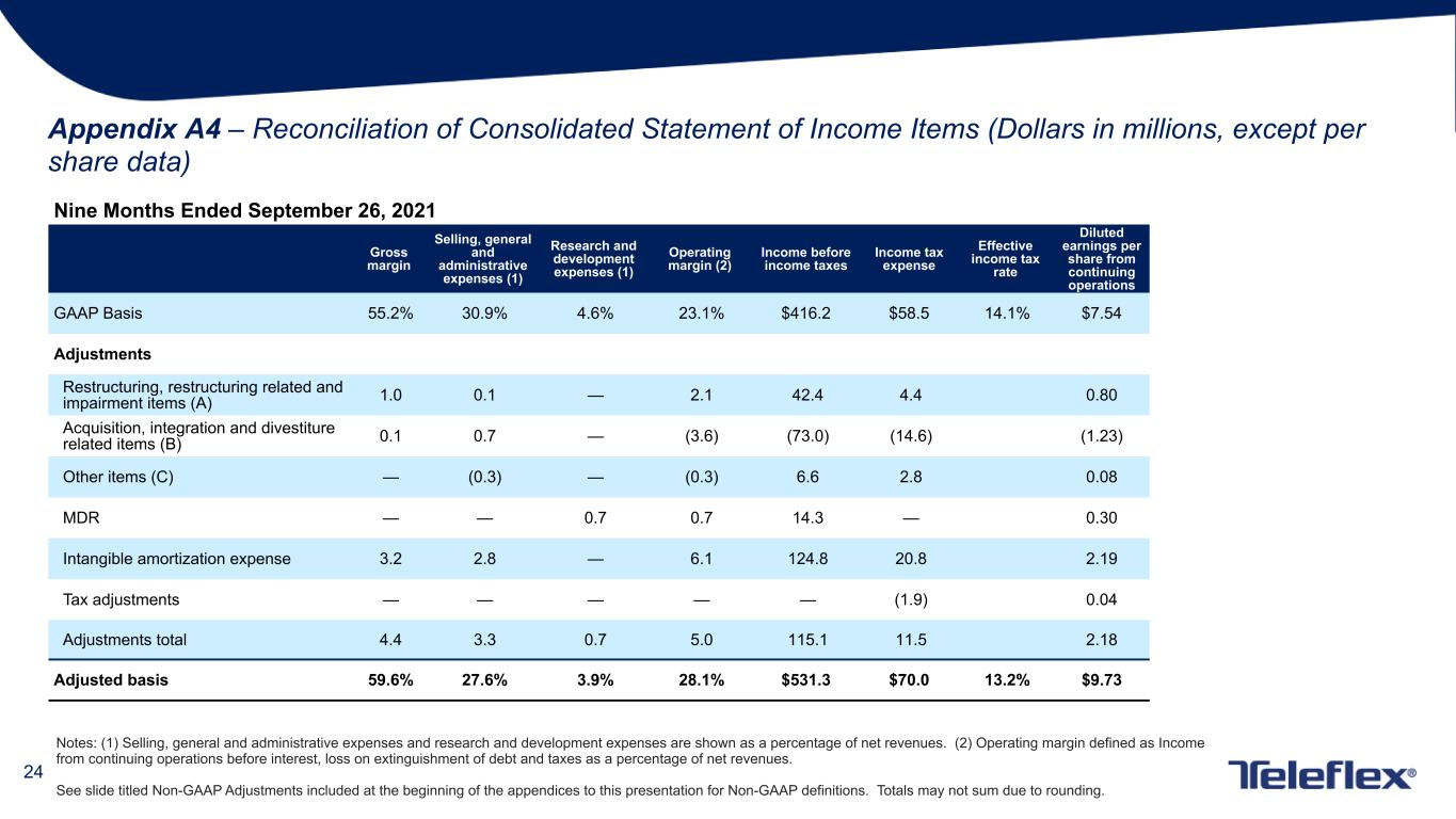 23附录A3 –合并损益表项目的调节(百万美元,每股数据除外)截至2022年9月25日的九个月销售毛利率,一般和管理费用(1)研发费用(1)营业利润率(2)所得税前收入所得税费用实际所得税率持续经营业务每股摊薄收益GAAP基础54.5% 31.0% 5.5% 18.3% 336.5美元51.7美元15.4% 6.02美元调整重组,重组相关和减值项目(A)1.1 — 1.225.3 2.3 0.49收购,一体化与资产剥离有关的项目(B)—(0.1)—(0.2)(4.5)(1.4)(0.07)MDR —(1.5)1.429.4 — 0.62无形资产摊销费用3.3(2.7)— 6.01 22.04.6 2.48税项调整——————调整总额4.4(2.8)(1.5)8.417 2.25.5 3.52调整基础58.9% 28.2% 4.0% 26.7% $ 508.7 $ 57.2 11.2% $ 9.54注:(1)销售、一般和管理费用以及研究和开发费用显示为净收入的百分比。(2)营业利润率定义为扣除利息、债务清偿损失和税收之前的持续经营收入占净收入的百分比。请参阅本演示文稿附录开头的标题为Non-GAAP调整的幻灯片,了解Non-GAAP定义。由于四舍五入,总数可能不相加。