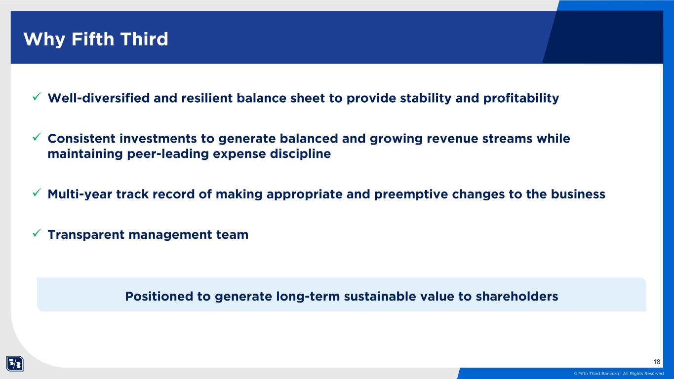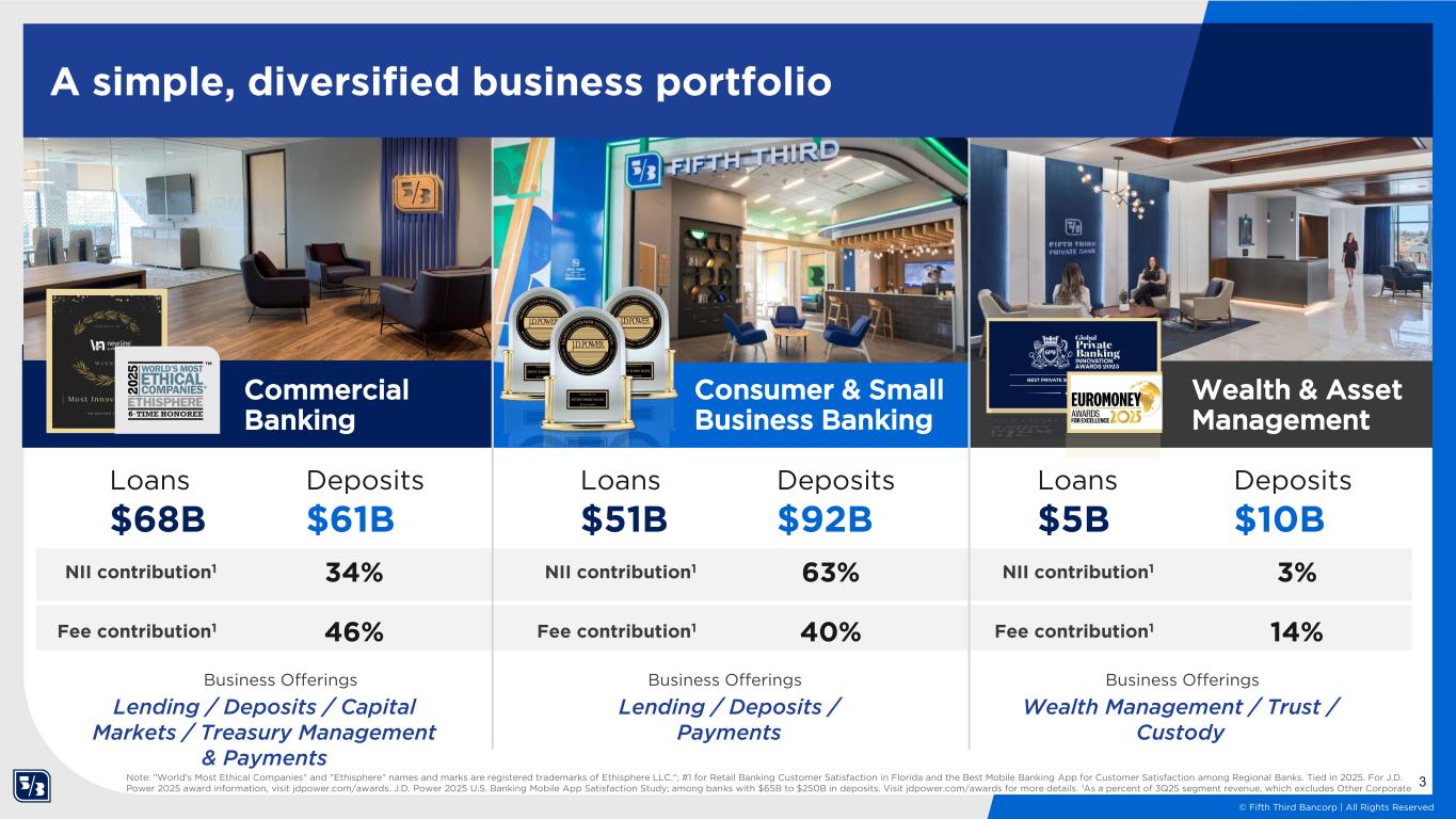 19©五三银行 |保留所有权利本演示文稿包含我们认为属于经修订的1933年证券法第27A条及其下颁布的规则175、经修订的1934年证券交易法第21E条及其下颁布的规则3b-6含义内的“前瞻性陈述”的陈述。除历史事实陈述外,所有陈述均为前瞻性陈述。这些报表涉及我们的财务状况、经营业绩、计划、目标、未来业绩、资本行动或业务。它们通常可以通过使用前瞻性语言来识别,例如“will likely result”、“may”、“are expected to”、“is expected”、“potential”、“estimate”、“forecast”、“projected”、“intends to”,或者可能包括其他类似的词或短语,例如“believe”、“plans”、“trend”、“objective”、“continue”、“remain”或类似的表达方式,或未来或条件动词,例如“will”、“would”、“should”、“could”、“might”、“can”或类似的动词。您不应过分依赖这些声明,因为它们受到风险和不确定性的影响,包括但不限于我们最近提交给美国证券交易委员会(“SEC”)的文件更新的10-K表格年度报告中列出的风险因素。有许多重要因素可能导致未来的结果与历史业绩和这些前瞻性陈述存在重大差异。可能造成这种差异的因素包括,但不限于:(1)信用质量恶化;(2)按借款人或抵押品所在地或行业划分的贷款集中度;(3)其他金融机构遇到的问题;(4)资金或流动性来源不足;(5)评级机构的不利行为;(6)无法维持或增长存款;(7)从子公司收取股息的能力受到限制;(8)网络安全风险;(9)五三银行通过使用计算机系统保护机密信息并交付产品和服务的能力和电信网络;(10)第三方服务提供商出现故障;(11)无法管理战略举措和/或组织变革;(12)无法实施技术系统增强,包括使用人工智能;(13)内部控制和其他风险管理程序出现故障;(14)与欺诈、盗窃、挪用或暴力;(15)无法吸引和留住技术人才;(16)政府监管的不利影响;(17)政府或监管的变化或其他行为;(18)未能满足适用的资本要求;(19)监管机构对五三银行的资本计划提出异议;(20)监管五三银行的衍生品活动;(21)存款保险费;(22)对有序清算基金的评估;(23)国家或地方经济的疲软;(24)全球政治和经济的不确定性或负面行动;(25)利率变化和通货膨胀的影响;(26)美国贸易政策的变化,包括征收关税和报复性关税;(27)资本市场的变化和趋势;(28)五三银行股价的波动;(29)抵押银行业务收入的波动;(30)诉讼、调查和执行程序;(31)违反合同契约、陈述和保证;(32)金融服务业的竞争和变化;(33)采用实时支付网络的潜在影响;(34)改变零售分销策略、客户偏好和行为;(35)难以识别、获得或整合合适的战略合作伙伴关系,投资或收购;(36)未来收购的潜在稀释;(37)收入损失和/或在出售和分离业务、投资或其他资产时遇到的困难;(38)投资或被收购实体的结果;(39)会计准则变更或解释或五三银行的商誉或其他无形资产价值下降;(40)模型使用不准确或其他失败;(41)关键会计政策和判断的影响或使用不准确的估计;(42)与天气有关的事件、其他自然灾害、或突发卫生事件(包括流行病);(43)这些或其他发展造成的声誉风险对业务生成和保留、资金和流动性等事项的影响;(44)影响我们的资本行动的法律或由五三银行的监管机构施加的要求的变化,包括股息支付和股票回购;(45)五三银行实现其环境和/或社会目标、目标和承诺的能力;(46)与Comerica Incorporated的未决合并有关的风险,包括五三银行无法实现未决合并的预期收益, 未能满足未决合并的完成条件或未决合并的完成出现意外延迟,未能获得所需的监管、股东或其他批准,以及由于未决合并而扰乱了五三银行的业务。有关其他因素的进一步信息,您应该参考我们向美国证券交易委员会(SEC)提交的定期和当前报告,这些因素可能会导致实际结果与这些前瞻性陈述中明示或暗示的结果存在显着差异。此外,您应该将这些声明视为仅在做出这些声明之日发表,并且仅基于我们当时实际知道的信息。我们明确表示不承担任何义务或承诺公开发布对此处包含的任何前瞻性陈述的任何更新或修订,以反映我们预期的任何变化或任何此类陈述所依据的事件、条件或情况的任何变化,除非法律可能要求,我们主张保护1995年《私人证券诉讼改革法案》中包含的前瞻性陈述的安全港。此处包含的信息旨在进行整体审查,适用于本新闻稿某一部分中给定信息的任何规定、条件或但书应理解为比照适用于此处出现的此类信息的所有其他实例。年化、备考、预测和估计数字仅用于说明目的,并非预测,可能无法反映实际结果。在这个演示文稿中,我们有时可能会提供非GAAP财务信息。请注意,尽管非GAAP财务指标为分析师、投资者和监管机构提供了有用的见解,但不应孤立地考虑或依赖它们来替代使用GAAP指标的分析。我们在25年第三季度收益报告的幻灯片39-40以及25年第三季度收益报告的第27至29页中提供了关于非GAAP措施以及与最直接可比的GAAP措施的对账的讨论。如果管理层无法提供对账项目的有意义或准确的计算或估计,并且没有不合理的努力就无法获得信息,则管理层不会为前瞻性的非GAAP财务指标提供对账。这是由于预测发生的内在困难以及尚未发生、超出Bancorp控制或无法合理预测的各种项目的财务影响。出于同样的原因,Bancorp的管理层无法解决无法获得的信息的可能意义。在没有最直接可比的GAAP财务指标的情况下提供的前瞻性非GAAP财务指标可能与相应