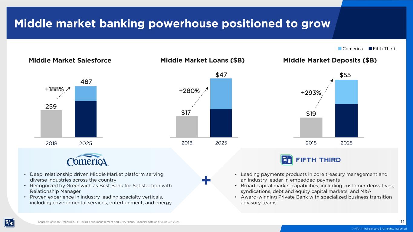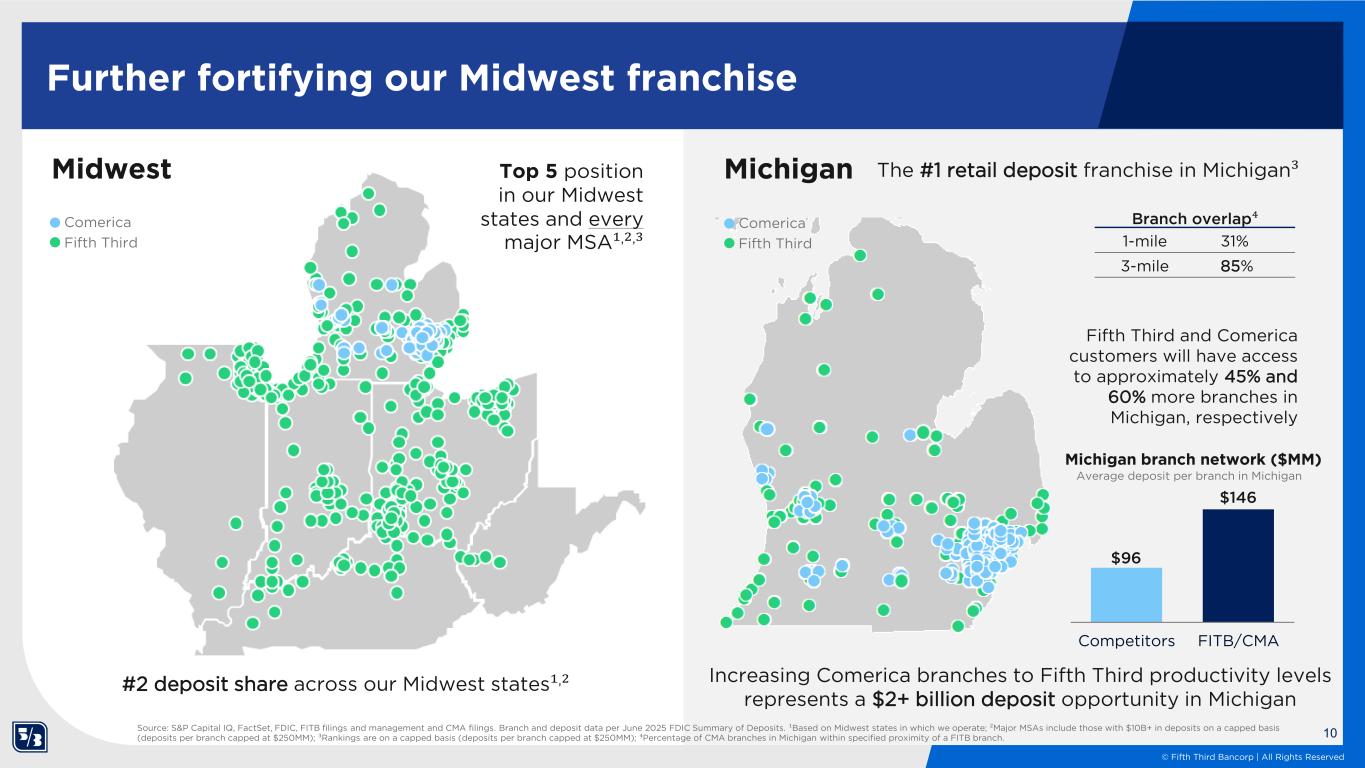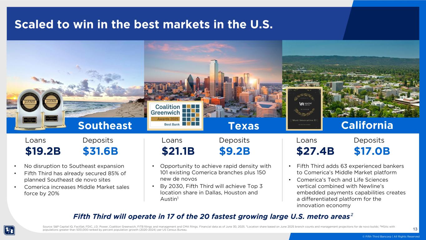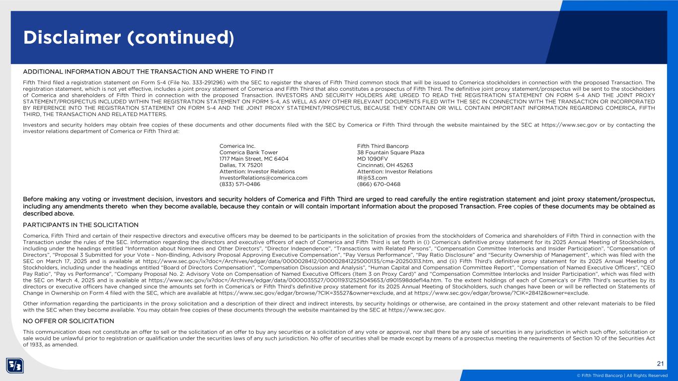 20©五三银行 |保留所有权利前瞻性陈述本演示文稿包含的陈述构成“前瞻性陈述”,其含义受经修订的《证券法》第27A条、经修订的1934年《证券交易法》第21E条以及1995年《美国私人证券诉讼改革法案》的安全港条款的保护,并受其保护。前瞻性陈述可以通过“实现”、“预期”、“假设”、“相信”、“可以”、“交付”、“驱动”、“增强”、“估计”、“预期”、“专注”、“未来”、“目标”、“成长”、“指导”、“打算”、“可能”、“可能”、“计划”、“立场”、“潜力”、“预测”、“项目”、“机会”、“展望”、“应该”、“战略”、“目标”、“轨迹”、“趋势”、“将”、“将”等类似词语和表达方式或此类术语的否定或其他类似术语的否定。前瞻性陈述包括但不限于关于我们的业务战略、目标和目的、预计财务和经营业绩的陈述,包括对未来增长的展望,以及未来的普通股股息、普通股回购和其他资本用途。这些陈述不是历史事实,而是代表我们对未来事件的信念,其中许多事件,就其性质而言,本质上是不确定的,不在我们的控制范围内。Comerica Incorporated(“联信银行”)和五三银行(“五三银行”)的实际结果和财务状况可能与这些前瞻性陈述中所述的存在重大差异。可能导致联信银行和五三银行的实际结果、财务状况和预测与此类前瞻性陈述中所示的存在重大差异的重要因素包括,除了我们和五三银行向美国证券交易委员会(“SEC”)提交的文件中所述的内容外:(1)联信银行与五三银行的合并(“交易”)可能无法完全实现或可能需要比预期更长的时间才能实现的成本节约和协同效应;(2)联信银行与五三银行之间的合并协议中规定满足交易的成交条件未能满足,或交易完成方面的任何意外延迟或任何事件、变化或其他情况的发生,包括任何政府关闭的影响和时间,这可能会延迟交易或可能导致合并协议的终止;(3)目前未决或以后可能针对联信银行、五三银行或合并后公司提起的任何法律或监管程序或政府调查或调查的结果;(4)由于需要监管,交易没有按预期完成或根本没有完成的可能性,未及时或根本未收到或满足股东或其他批准及其他交割条件(以及此类批准可能导致施加可能对合并后公司或拟议交易的预期收益产生不利影响的条件的风险);(5)交易产生的收益可能无法完全实现或可能需要比预期更长的时间才能实现的风险,包括由于一般经济和市场条件、利率和汇率、货币政策、法律法规及其执行情况的变化或由此产生的问题,以及联信银行和五三银行经营所在地理和业务领域的竞争程度;(6)由于交易的公告和未决而对各方的业务造成干扰;(7)与交易未决的预计时间长度相关的成本,包括最终合并协议中包含的关于在交易未决期间联信银行或五三银行在正常过程之外经营其业务的能力的限制;(8)与拟议交易完成后合并后公司扩大后的业务和运营的管理和监督相关的风险;(9)各方经营业务的整合将出现重大延迟或成本或难度高于预期的风险,或各方无法以其他方式成功地将各方的业务整合到对方的业务中;(10)可能性交易的完成成本可能高于预期,包括由于意外因素或事件;(11)联信银行或五三银行的客户、员工、供应商、承包商或其他业务合作伙伴的声誉风险和潜在不良反应, 包括因该交易已公告或完成而导致的;(12)五三银行就该交易增发其普通股导致的稀释;(13)联信银行或五三银行的状况发生重大不利变化;(14)联信银行或五三银行的业务表现与管理层预期一致的程度;(15)联信银行和TERM5五三银行利用增长机会并在时间范围内和按照目前预期的条款实施有针对性举措的能力;(16)无法持续实现收入和盈利增长;(17)执行以及近期战略投资的成效;(18)联信银行直通快递转型的时机和影响;(19)宏观经济因素的影响,例如总体经济状况以及货币和财政政策的变化,特别是对利率的影响;(20)客户行为的变化;(21)有关信用质量的不利发展;(22)联信银行或五三银行客户的业务或行业下降;(23)合并后公司因拟议交易后扩大合并后公司业务运营而受到额外监管要求的可能性;(24)一般竞争性,可能影响联信银行和五三银行未来业绩的政治和市场条件以及其他因素,包括资产质量和信用风险的变化;(25)安全风险,包括网络安全和数据隐私风险,以及资本市场;(26)通货膨胀;(27)技术变革的影响、程度和时机;(28)资本管理活动;(29)竞争性产品和定价压力;(30)法律和监管程序以及相关金融服务业事项的结果;以及(31)是否符合监管要求。本演示文稿中的任何前瞻性陈述仅基于我们目前可获得的信息,并且仅在其发表之日发表。我们不承担公开更新可能不时作出的任何前瞻性陈述的义务,无论是书面的还是口头的,无论是由于新信息、未来发展或其他原因,除非法律要求。这些因素和其他重要因素,包括联信银行截至2024年12月31日止年度的10-K表格年度报告(可在以下网址查阅:https://www.sec.gov/ix?doc?doc=/archives/edgar/data/0000028412/000002841225000108/cma-20241231.htm)中“风险因素”下讨论的因素,以及五三银行截至2024年12月31日止年度的10-K表格年度报告中(可在以下网址查阅:https://www.sec.gov/ix?doc=/archives/edgar/data/0000035527/000003552725000079/fitb-20241231.htm),以及联信银行和五三银行随后的filfilfilfilfilfilfilfilfilfilfilfilfilfilfilf此处的前瞻性陈述仅在首次发布之日作出,除非适用的