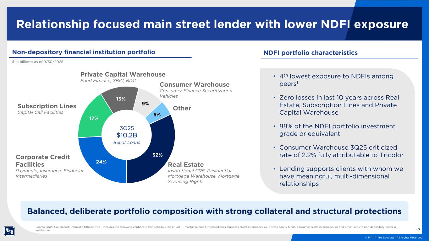 17©五三银行 | All Rights Reserved Relationship Focused Main Street Lenders with Lower NDFI敞口32% 24% 17% 13% 9% 5% 3Q25 $ 10.2B 8% of Loans Non-Depository Financial Institution Portfolio以十亿美元计;截至2025年9月30日• NDFI敞口在同行中排名第四•过去10年房地产、认购额度和私人资本仓库的零损失• NDFI投资级别或同等级别的88% • Consumer Warehouse 3Q25批评率为2.2%,完全归因于Tricolor •贷款支持我们有意义的客户,多维关系消费仓库消费金融证券化载体民间资本仓库基金金融、SBIC、BDC其他房地产机构CRE、住宅抵押仓库、抵押服务权企业信贷融通支付、保险、金融中介认购额度资金Call融通NDFI组合特征均衡,刻意组合构成具有较强的抵押品和结构保护来源:3Q25 Call Report;国内办事处;1NDFI在计划范围内包括以下标题RC-C Part I –抵押信贷中介、商业信贷中介、私募股权基金、消费信贷中介和其他向非存款性金融机构提供的贷款