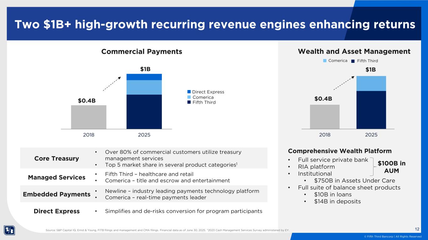 11©五三银行 |保留所有权利的中间市场银行强国,定位于发展中间市场赛富时中间市场贷款($ B)中间市场存款($ B)•深度、关系驱动的中间市场平台,服务于全国不同行业•被格林威治认定为客户关系管理器满意的最佳银行•在行业领先的专业垂直领域拥有成熟的经验,包括环境服务、娱乐、和能源20182025 + 188% 25948720182025 + 280% $ 4720182025 + 293% $ 55 $ 17 $ 19 + •核心财资管理领域的领先支付产品和嵌入式支付领域的行业领导者•广泛的资本市场能力,包括客户衍生品、银团、债务和股权资本市场以及并购•拥有专业业务转型咨询团队的屡获殊荣的私人银行Fifth Third Comerica资料来源:Coalition Greenwich,FITB备案和管理以及CMA备案。截至2025年6月30日的财务数据。