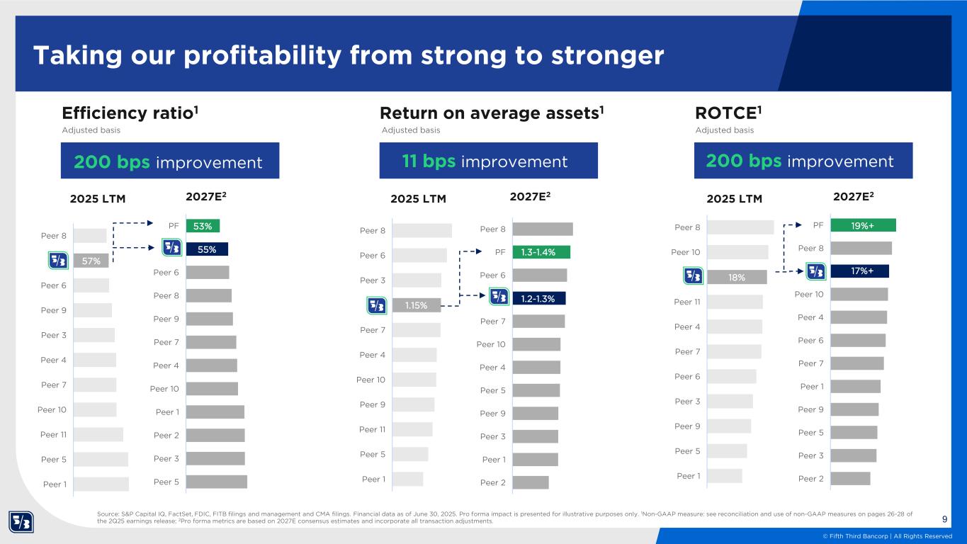 ibdroot \ projects \ IBD-NY \ burger2025 \ 973442 _ 1 \ presentations \05。投资者说明会\ PPT \项目快报投资者说明会_ v24.pptx8©五三银行 | All Rights Reserved Combination利用特许经营优势创造价值Now:一项引人注目的战略交易加速了我们的战略•在核心和高增长市场推动密度和粒度•在增长最快的美国市场扩大影响力•加强和扩大高ROE,经常性收费平台优越的财务结果•没有有形的每股账面价值稀释——投资的即时“现金对现金”回报• 22%的内部收益率,具有确定和可实现的费用协同效应——优于有机替代品长期:2年内的增长平台:更稳定和盈利的公司我们拥有成熟的专业知识和业绩记录,可以兑现这一引人注目的战略机会市场领导地位和扩张•堡垒#在我们中西部市场的第二位置——在我们所有中西部州的前4位² •在高增长的东南地区获得前5名的明确路径和德州市场↓ —在20个增长最快的大型MSA中的17个开展业务↓转型增长潜力•创建具有专业垂直领域的全国中间市场银行强国•两个$ 1B +的高增长、经常性收入引擎:商业支付和财富与资产管理进一步提升稳定性和盈利能力• 19% + ROTCE丨— 200 + bps改善• 50年代中低时期的效率比丨200 + bps改善更广泛、更具弹性的业务组合•业务线、地域和费用多元化•更精细的贷款组合•来自规模化收费业务的持久、经常性收入资料来源:标普 Capital IQ、FactSet、FDIC,FITB备案以及管理层和CMA备案。根据2025年6月FDIC存款汇总的分支机构和存款数据。备考影响仅供说明之用。1Non-GAAP衡量标准:见2Q25收益发布第26-28页的non-GAAP衡量标准的调节和使用。备考指标基于2027年共识估计,并包含所有交易调整;²排名以上限为基础(每个分支机构的存款上限为250mm美元);↓基于2025年6月分支机构数量和从头构建的管理预测的位置份额;↓根据美国人口普查局,人口超过50万的MSA按人口增长百分比(2020-2024年)排名。