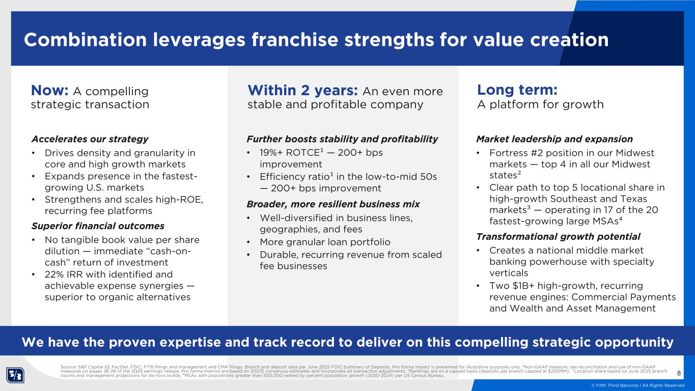 ibdroot \ projects \ IBD-NY \ burger2025 \ 973442 _ 1 \ presentations \05。投资者说明\ PPT \项目快报投资者说明_ v24.pptx7©五三银行 |保留所有权利五三银行和联信银行:现在推进增长和盈利:2年内一项引人注目的战略交易:一家更加稳定和盈利的公司资产² $ 288B存款² $ 224B贷款² $ 174B创造美国第9大银行丨长期:增长的平台资料来源:标普 Capital IQ,FactSet,FITB备案以及管理层和CMA备案。截至2025年6月30日的财务数据。丨以总资产为基础。排名由美国商业银行组成,不包括外国、信托和传统投资银行;²截至2025年6月30日的备考资产负债表指标,不包括采购会计调整,以用于说明目的。