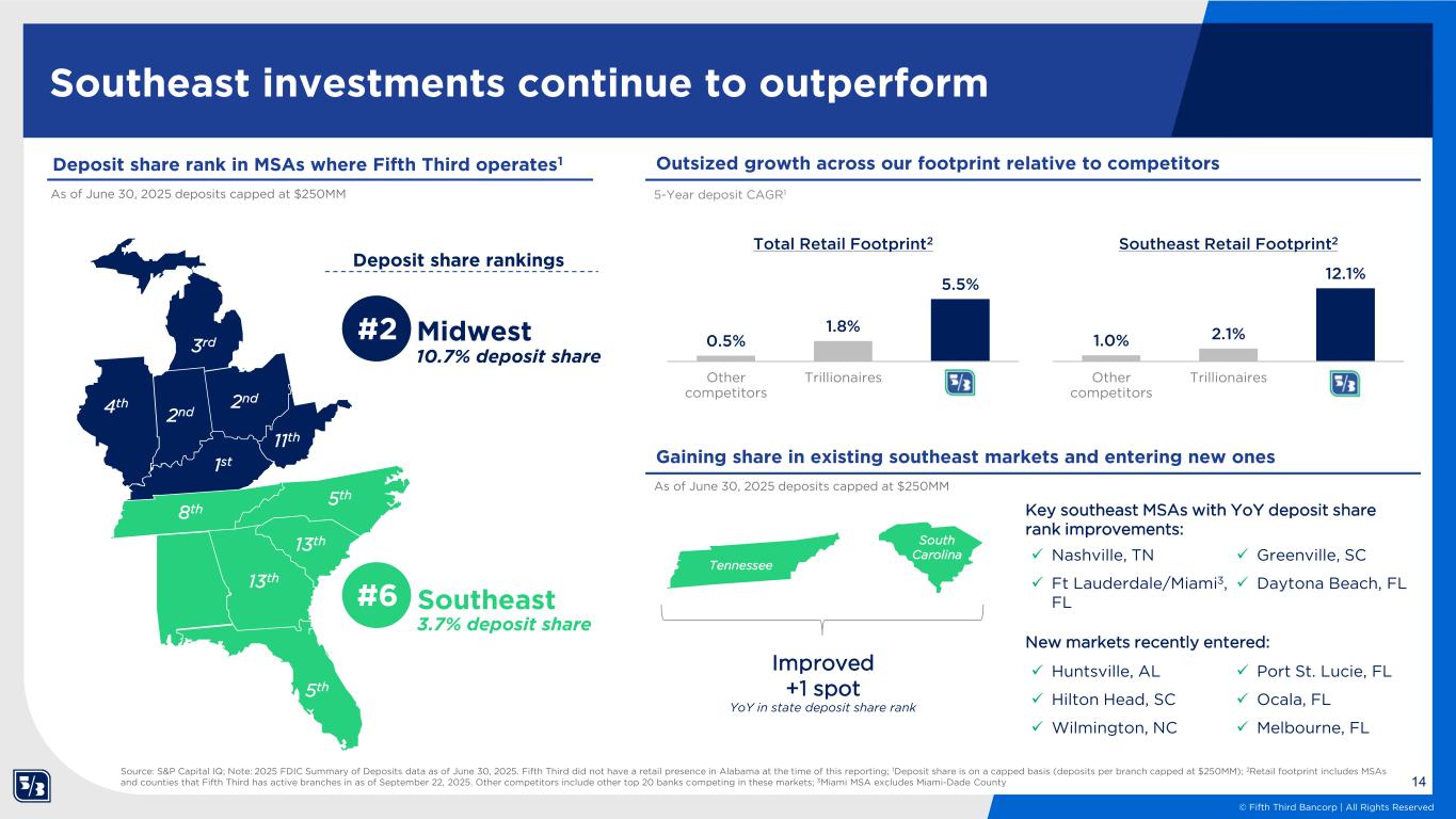 13©五三银行 | All Rights Reserved Scaled to win in the best markets in the U.S. 五三银行将在美国增长最快的20个大型都会区中的17个开展业务² California • Texas •有机会实现快速密度,现有101家联信银行分支机构加上150家新的de novo •到2030年,TERM3将在达拉斯实现前3的位置份额,休斯顿和奥斯汀1 • 五三银行为联信银行的中间市场平台增加63名经验丰富的银行家• 联信银行的技术和生命科学垂直领域与Newline的嵌入式支付能力相结合,为创新经济贷款$ 21.1B存款$ 9.2B贷款$ 27.4B存款$ 17.0b •不中断东南扩张• 五三银行已经获得了计划中的东南从头站点的85% • 联信银行将中间市场销售队伍增加20%贷款$ 19.2B存款$ 31.6B资料来源:标普 Capital IQ、FactSet、FDIC、J.D. Power、Coalition Greenwich、FITB备案和管理以及CMA备案。截至2025年6月30日的财务数据。↓位置份额基于2025年6月的分支机构数量和de novo构建的管理预测;²根据美国人口普查局,人口超过500,000的MSA按人口增长百分比(2020-2024年)排名。德克萨斯州东南部