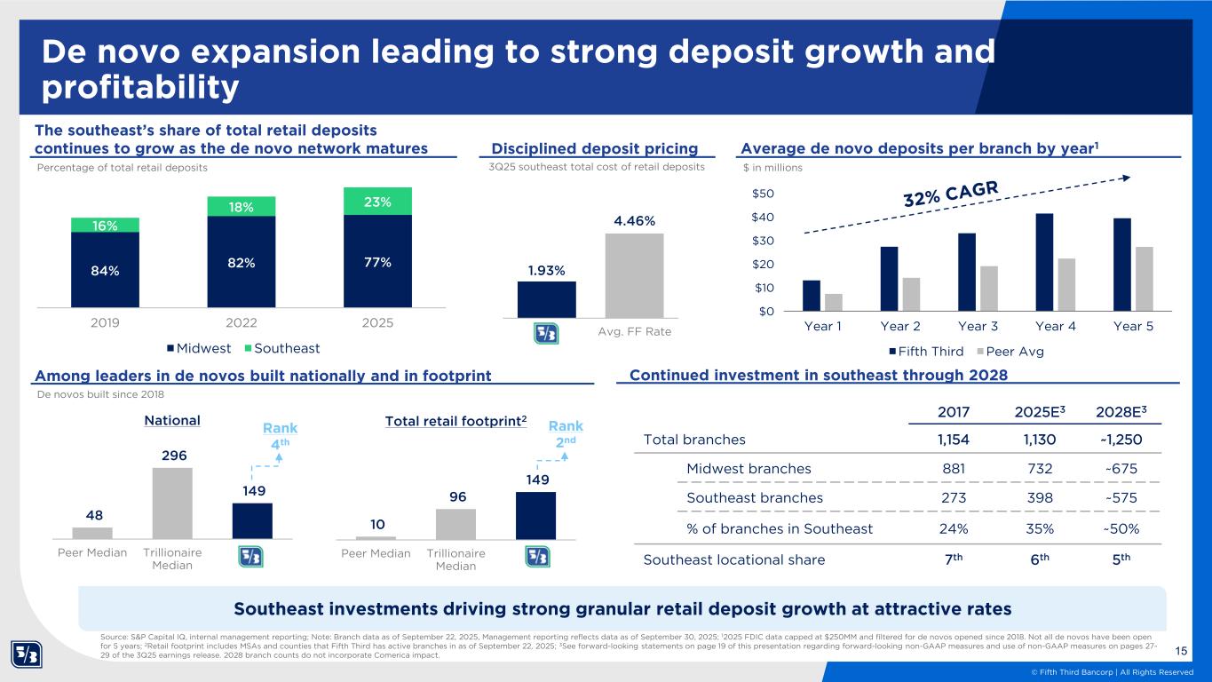 14©五三银行 |保留所有权利的东南投资继续跑赢mSA中的存款份额排名,mSA在mSA中的排名为1截至6月30日,2025存款上限为250mm美元8th 11th 5th 13th 13th 4th 2nd 1st 5th 2nd 3rd相对于竞争对手,我们足迹上的超额增长5年存款CAGR1 Midwest # 2 Southeast # 610.7%存款份额3.7%存款份额来源:标普 Capital IQ;注:2025年FDIC截至2025年6月30日的存款数据摘要。在撰写本报告时,五三银行在阿拉巴马州没有零售业务;1存款份额有上限(每个分支机构的存款上限为250mm美元);2零售足迹包括MSA和截至2025年9月22日五三银行在阿拉巴马州有活跃分支机构的县。其他竞争对手包括在这些市场竞争的其他前20大银行;3Miami MSA不包括迈阿密-戴德县存款份额排名0.5% 1.8% 5.5%其他竞争对手Trillionaires x Total Retail Footprint2在现有东南市场获得份额并进入新市场1.0% 2.1% 12.1%其他竞争对手Trillionaires x Southeast Retail Footprint2 Tennessee South Carolina州存款份额排名同比提高+ 1位存款份额排名同比提高的东南部关键MSA:丨田纳西州纳什维尔丨FT Lauderdale/Miami3,FL丨格林维尔,SC丨代托纳比奇,FL最近进入的新市场:丨亨茨维尔,AL Hilton Head,SC丨威尔明顿,NC丨Port St. Lucie,FL丨Ocala,FL丨Melbourne,FL截至2025年6月30日存款上限为$ 250mm