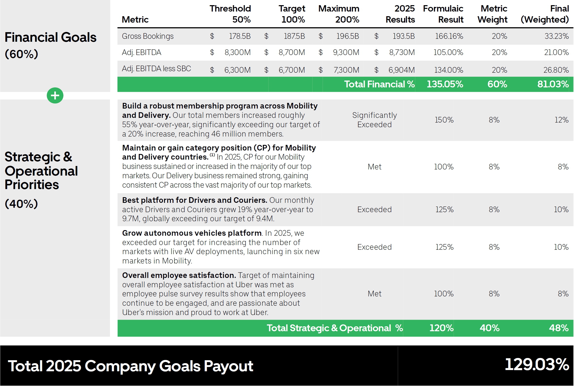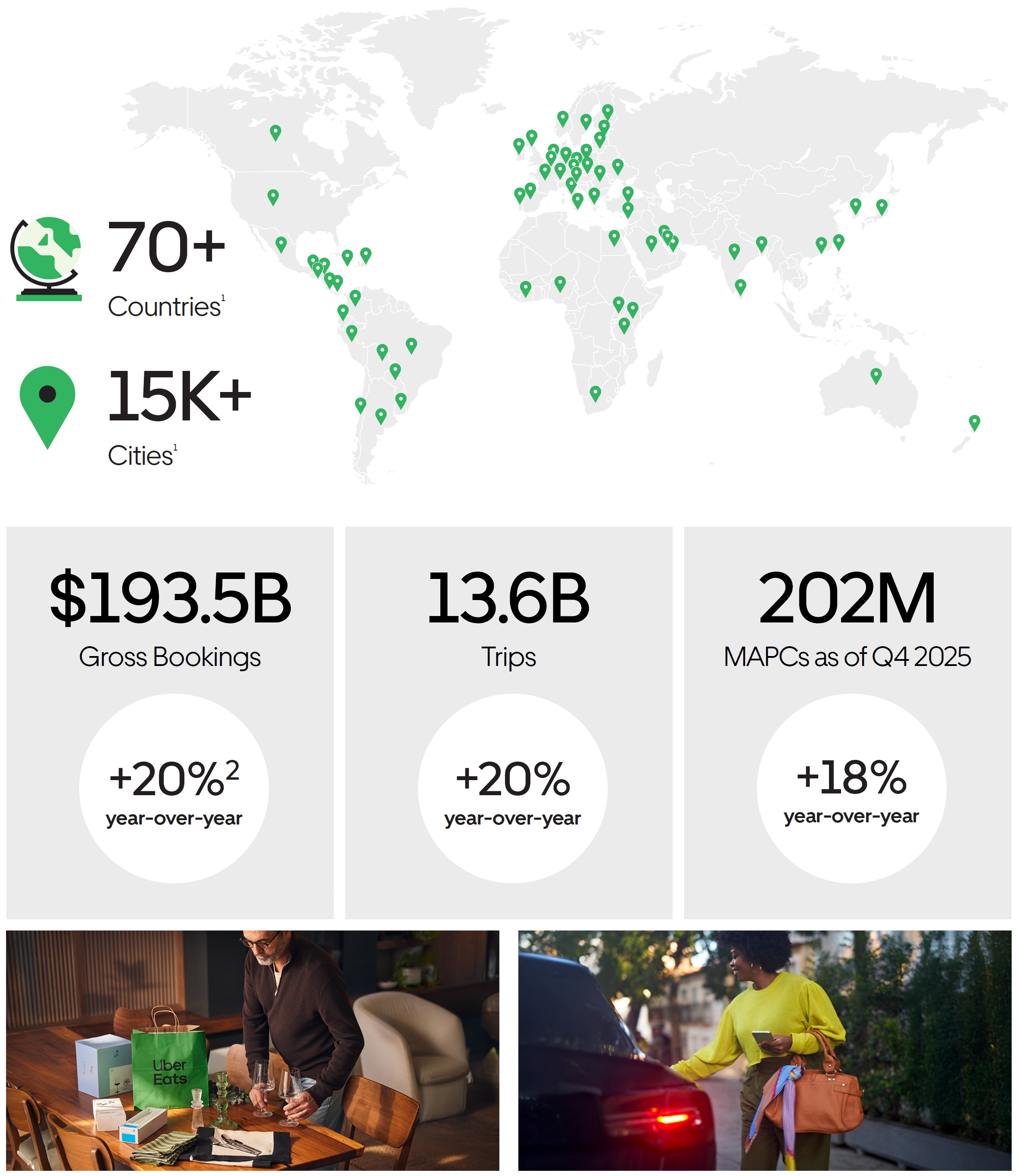 我们代表我们整个董事会感谢您对优步的持续支持。2025年又是一个运营强劲的年份——优步连续第五年实现20% +的年度总预订量增长。(1)很少有公司能够在这样的规模上产生如此大的增长,我们为将我们带到这一点的执行力和创新感到自豪。9月,优步加入了标普 100指数,这反映了我们的规模和资金实力。我们以可观的势头、规模化和盈利的平台、清晰的运营框架进入2026年,以继续推动持久增长。