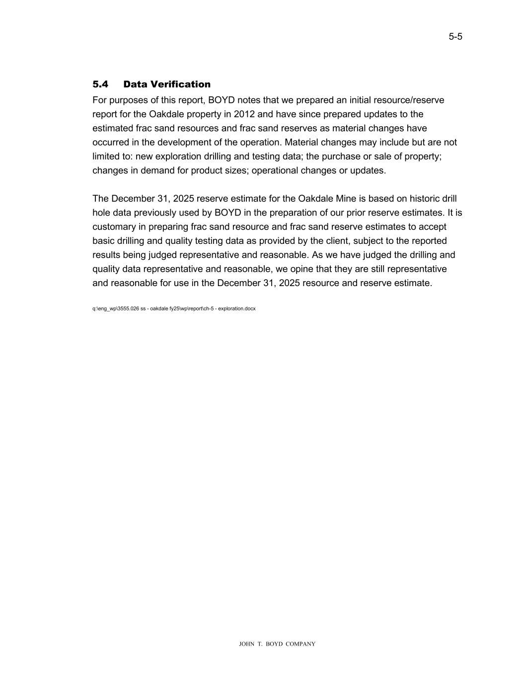 5-5 JOHN T. BOYD COMPANY 5.4数据验证就本报告而言,BOYD注意到,我们在2012年为Oakdale资产编制了初步资源/储量报告,此后随着业务开发过程中发生重大变化,准备了对估计压裂砂资源和压裂砂储量的更新。材料变化可能包括但不限于:新的勘探钻探和测试数据;购买或出售财产;对产品尺寸的需求变化;操作变化或更新。Oakdale矿2025年12月31日的储量估算是基于BOYD之前在编制我们之前的储量估算时使用的历史钻孔数据。在编制压裂砂资源和压裂砂储量估算时,习惯上接受客户提供的基础钻探和质量测试数据,但报告的结果被判定为具有代表性和合理性。由于我们判断钻井和质量数据具有代表性和合理性,我们认为它们在2025年12月31日资源和储量估算中仍具有代表性和使用合理性。q:\ eng _ wp \ 3555.026 ss-oakdale fy25 \ wp \ report \ ch-5-exploration.docx