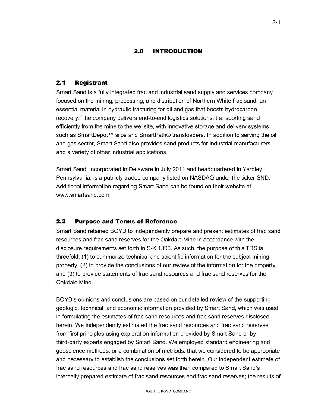 1-1 JOHN T. BOYD公司1.0执行摘要1.1简介Smart Sand的Oakdale矿是一家活跃的地表砂开采和加工企业,自2012年开始运营以来一直从Mount Simon砂岩组生产各种成品压裂砂产品。BOYD被Smart Sand聘用,以完成对我们对压裂砂资源和压裂砂储量的初步独立技术审计(BOYD报告编号3555.021a)的更新——针对Oakdale矿。本TRS的目的有三个:(1)为标的财产总结技术和科学信息,(2)提供我们为财产审查信息的结论,以及(3)根据美国证券交易所(SEC)条例S-K(S-K 1300)第1300分部第601(b)(96)项中规定的披露要求,提供Oakdale矿的压裂砂资源和压裂砂储量报表。BOYD的调查结果是基于我们对所获得的支持性地质、技术和经济信息的详细审查:(1)数据、报告和Smart Sand提供的其他信息,(2)现有的BOYD工作档案和报告,(3)与Smart Sand人员的讨论,(4)在监管机构存档的记录,(5)数据、报告和其他来自公共来源的信息,以及(6)BOYD拥有的非机密信息。我们进行调查是为了获得合理保证,即Smart Sand的压裂砂资源和压裂砂储量报表不存在重大错报。本报告提供对有关Smart Sand对其位于威斯康星州奥克代尔的资产下面的压裂砂资源和压裂砂储量估计的初步独立审计的更新结果。这些估算的基础是Smart Sand最初于2021年7月完成的压裂砂资源量和压裂砂储量的体积地质模型。Smart Sand提供了更新的特定站点和运营信息,以使这一估计值截至2025年12月31日是最新的。除非另有说明,此处提供的信息的生效日期,包括压裂砂资源和压裂砂储量的估计,为2025年12月31日。