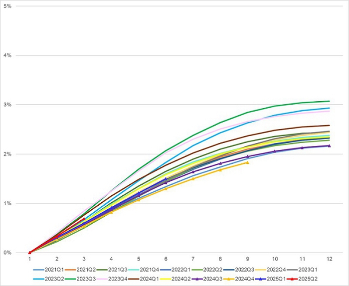 下图显示截至2025年9月30日通过公司平台在中国内地促成的贷款产品按贷款发起年份划分的历史累计30天加逾期拖欠率。本公司不承担本金风险的轻资本模式下促成的贷款被排除在图表之外。