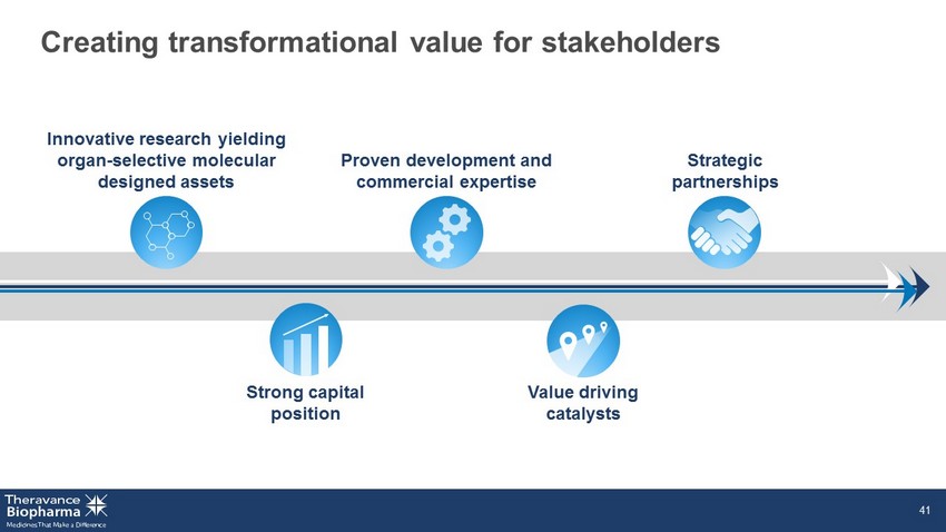 GSK’s TRELEGY ELLIPTA 1 ‣ Asthma sNDA asthma approved September 9, 2020 TD - 8236 ‣ Phase 1 Part C data in severe asthmatics ‣ Phase 2 allergen challenge data Ampreloxetine ‣ Phase 3 4 - week efficacy data TD - 1473 ‣ Phase 2b/3 ulcerative colitis topline data ‣ Phase 2 Crohn’s topline data Multiple potential milestones and value - driving catalysts expected in 2020, 2021 and beyond 1. TBPH holds 85% economic interest in upward - tiering royalty stream of 6.5% – 10% payable by GSK (net of TRC expenses paid and the amount of cash, if any, expected to be used by TRC pursuant to the TRC Agreement over the next four fiscal quarters). 75% of royalties received pledged to service outstanding notes, 25% of royalti es received retained by TBPH. All statements concerning TRELEGY ELLIPTA based on publicly available information. 40 TD - 0903 ‣ Phase 1 study in healthy volunteers in the UK ‣ Phase 2 study in hospitalized patients with COVID - 19 in the UK – Part 2: multi - center study conducted at hospital - based clinical sites globally, including the U.S. 2020 2021 Commercial progression of YUPELRI ® and GSK’s TRELEGY ELLIPTA TD - 5202 ‣ Phase 1 topline data