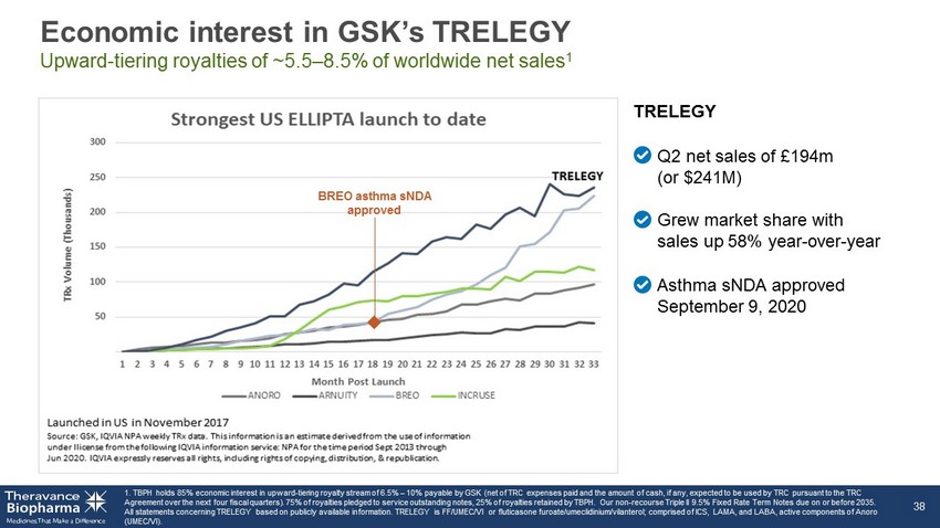 Economic interest in GSK’s TRELEGY Upward - tiering royalties of ~5.5 – 8.5% of worldwide net sales 1 Q2 net sales of £194m (or $241M) Grew market share with sales up 58% year - over - year Asthma sNDA approved September 9, 2020 1. TBPH holds 85% economic interest in upward - tiering royalty stream of 6.5% – 10% payable by GSK (net of TRC expenses paid and the amount of cash, if any, expected to be used by TRC pursuant to the TRC Agreement over the next four fiscal quarters). 75% of royalties pledged to service outstanding notes, 25% of royalties retained by TBPH. Our non - recourse Triple II 9.5% Fixed Rate Term Notes due on or before 2035. All statements concerning TRELEGY based on publicly available information. TRELEGY is FF/UMEC/VI or fluticasone furoate/umecl idi nium/vilanterol; comprised of ICS, LAMA, and LABA, active components of Anoro (UMEC/VI). 38 TRELEGY BREO asthma sNDA approved
