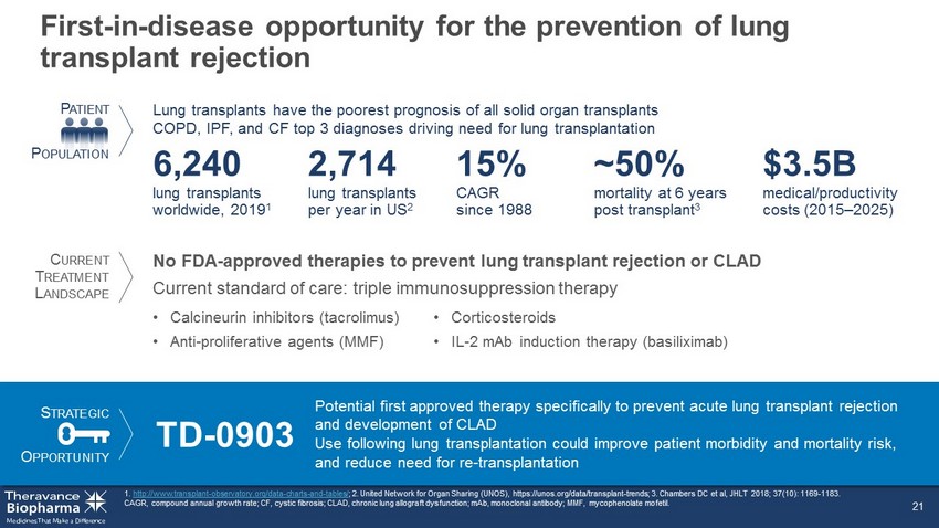 S TRATEGIC O PPORTUNITY First - in - disease opportunity for the prevention of lung transplant rejection 21 1. http://www.transplant - observatory.org/data - charts - and - tables/ ; 2. United Network for Organ Sharing (UNOS), https://unos.org/data/transplant - trends; 3. Chambers DC et al, JHLT 2018; 37(10): 1169 - 1183. CAGR, compound annual growth rate; CF, cystic fibrosis; CLAD, chronic lung allograft dysfunction; mAb, monoclonal antibody; M MF, mycophenolate mofetil. lung transplants per year in US 2 2,714 TD - 0903 Potential first approved therapy specifically to prevent acute lung transplant rejection and development of CLAD Use following lung transplantation could improve patient morbidity and mortality risk, and reduce need for re - transplantation Lung transplants have the poorest prognosis of all solid organ transplants COPD, IPF, and CF top 3 diagnoses driving need for lung transplantation CAGR since 1988 15% mortality at 6 years post transplant 3 ~50% • Calcineurin inhibitors (tacrolimus) • Anti - proliferative agents (MMF) No FDA - approved therapies to prevent lung transplant rejection or CLAD Current standard of care: triple immunosuppression therapy medical/productivity costs (2015 – 2025) $3.5B P ATIENT P OPULATION C URRENT T REATMENT L ANDSCAPE • Corticosteroids • IL - 2 mAb induction therapy (basiliximab) lung transplants worldwide, 2019 1 6,240