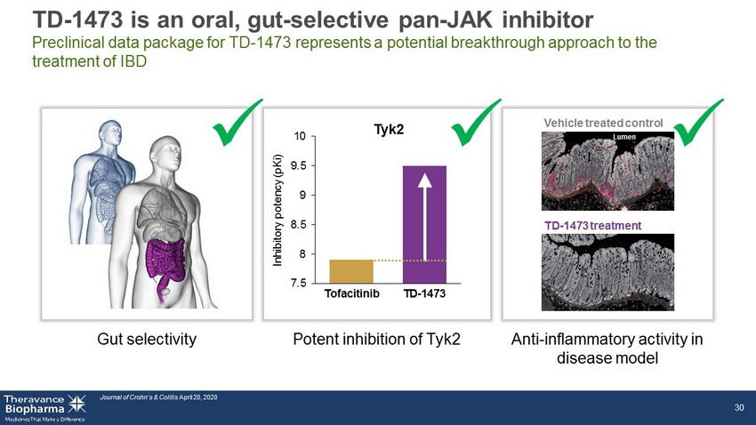 TD - 1473 is an oral, gut - selective pan - JAK inhibitor Preclinical data package for TD - 1473 represents a potential breakthrough approach to the treatment of IBD Journal of Crohn’s & Colitis April 20, 2020 30 Gut selectivity Potent inhibition of Tyk2 Anti - inflammatory activity in disease model x x Lumen Vehicle treated control TD - 1473 treatment x 7.5 8 8.5 9 9.5 10 Tofacitinib TD-1473 Inhibitory potency (pKi) Tyk2