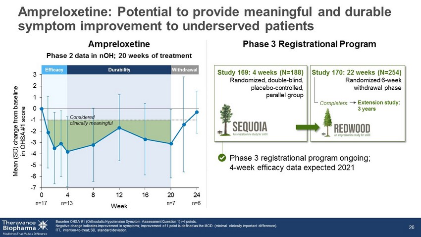 Untreated nOH NE Release at Neurovascular Junction Systolic Blood Pressure Designed to reduce symptoms of nOH by prolonging the effect of endogenous norepinephrine 1. Palma JA, Kaufmann H. Mov Disord Clin Pract 2017;4:298 - 308. NE, norepinephrine; NET, norepinephrine transporters. 25 Vasodilation Blood pressure Vasoconstriction Blood pressure Syncope Normal x Increase standing blood pressure x Increased brain profusion x Reduce symptoms of symptomatic nOH 1 NE A XON TERMINAL D ENDRITE + Ampreloxetine Ampreloxetine Reduction in syncope Normal