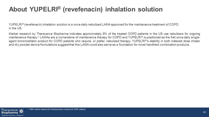 About YUPELRI ® (revefenacin) inhalation solution YUPELRI ® (revefenacin) inhalation solution is a once - daily nebulized LAMA approved for the maintenance treatment of COPD in the US . Market research by Theravance Biopharma indicates approximately 9 % of the treated COPD patients in the US use nebulizers for ongoing maintenance therapy . 1 LAMAs are a cornerstone of maintenance therapy for COPD and YUPELRI ® is positioned as the first once - daily single - agent bronchodilator product for COPD patients who require, or prefer, nebulized therapy . YUPELRI ® ’s stability in both metered dose inhaler and dry powder device formulations suggest that this LAMA could also serve as a foundation for novel handheld combination products . 1. TBPH market research (N=160 physicians); refers to US COPD patients. 43