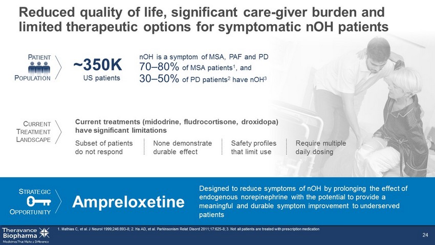 Reduced quality of life, significant care - giver burden and limited therapeutic options for symptomatic nOH patients 24 1. Mathias C, et al. J Neurol 1999;246:893 - 8; 2. Ha AD, et al. Parkinsonism Relat Disord 2011;17:625 - 8; 3. Not all patients are treated with prescription medication P ATIENT P OPULATION US patients ~350K Current treatments (midodrine, fludrocortisone, droxidopa) have significant limitations Subset of patients do not respond None demonstrate durable effect Safety profiles that limit use Require multiple daily dosing nOH is a symptom of MSA, PAF and PD 70 – 80% of MSA patients 1 , and 30 – 50% of PD patients 2 have nOH 3 S TRATEGIC O PPORTUNITY Ampreloxetine Designed to reduce symptoms of nOH by prolonging the effect of endogenous norepinephrine with the potential to provide a meaningful and durable symptom improvement to underserved patients C URRENT T REATMENT L ANDSCAPE